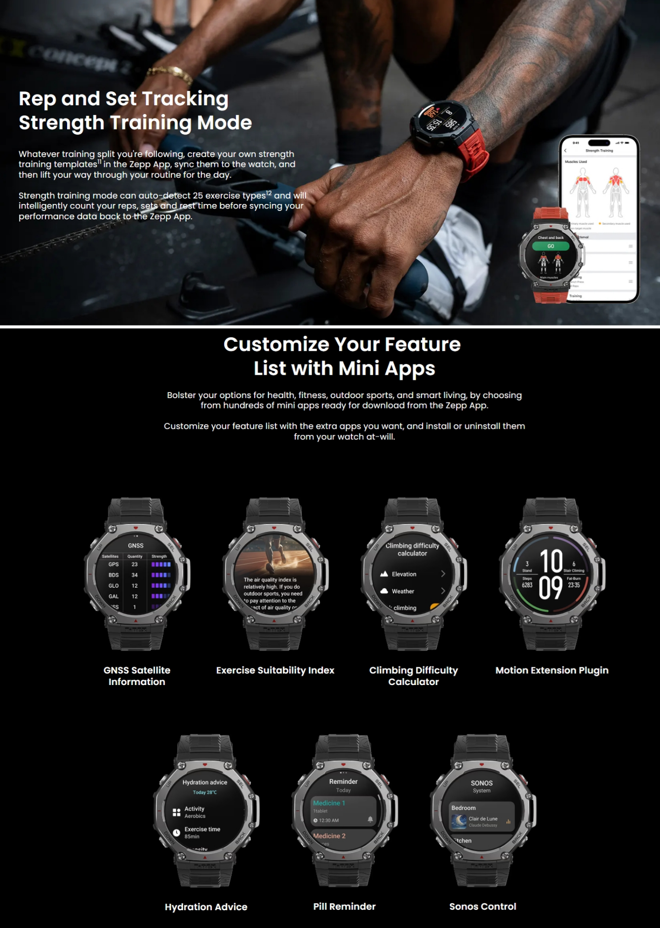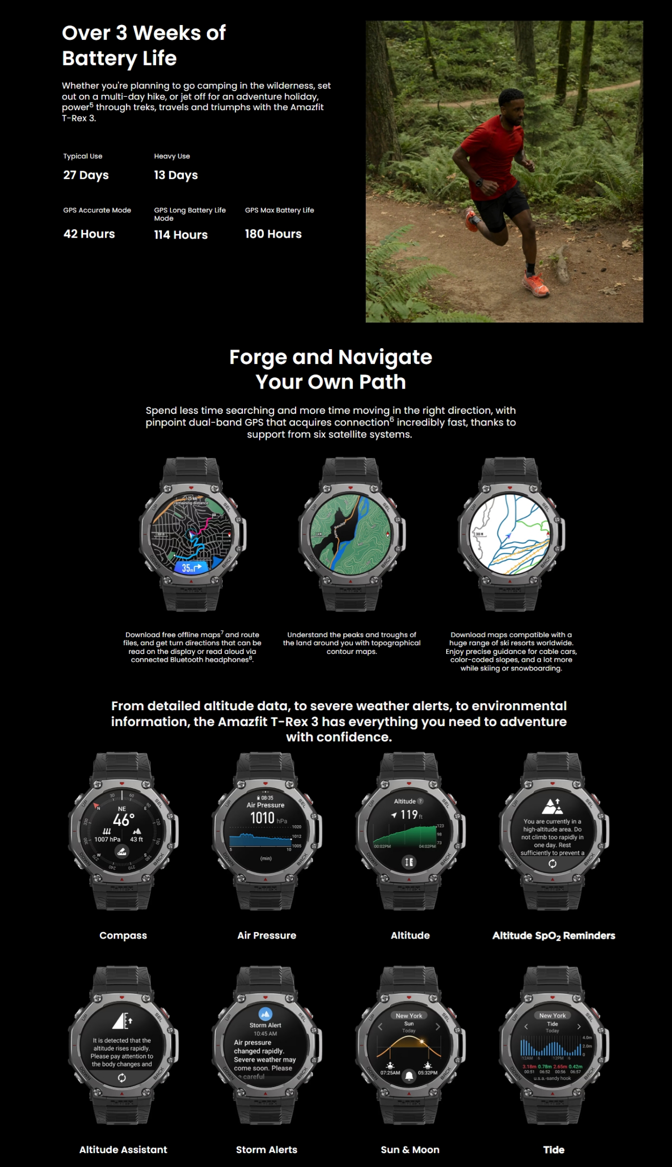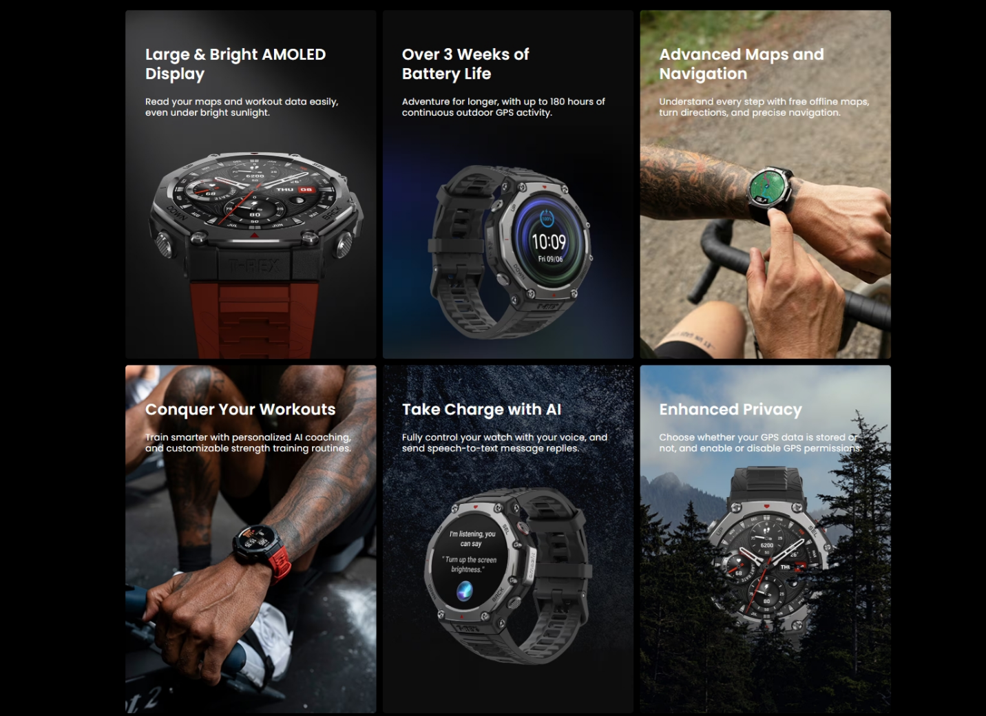 พร้อมสำหรับทุกสิ่งกับ Amazfit T-Rex 3 ดีไซน์หน้าจอ AMOLED ขนาดใหญ่และให้ความสว่าง เพื่อให้คุณอ่านแผนที่และข้อมูลการออกกำลังกายของคุณได้อย่างง่ายดายแม้ภายใต้แสงแดดจ้า ผจญภัยได้นานขึ้นด้วยกิจกรรม GPS กลางแจ้งต่อเนื่องสูงสุด 180 ชั่วโมง เข้าใจทุกขั้นตอนด้วยแผนที่ออฟไลน์ ทิศทางการเลี้ยว และการนำทางที่แม่นยำ ฝึกฝนอย่างชาญฉลาดด้วยการฝึกสอน AI ส่วนบุคคลและกิจวัตรการฝึกความแข็งแรงที่ปรับแต่งได้ และคุณยังสามารถควบคุมนาฬิกาของคุณอย่างสมบูรณ์ด้วยเสียงของคุณ และส่งคำตอบข้อความจากการพูดเป็นข้อความ