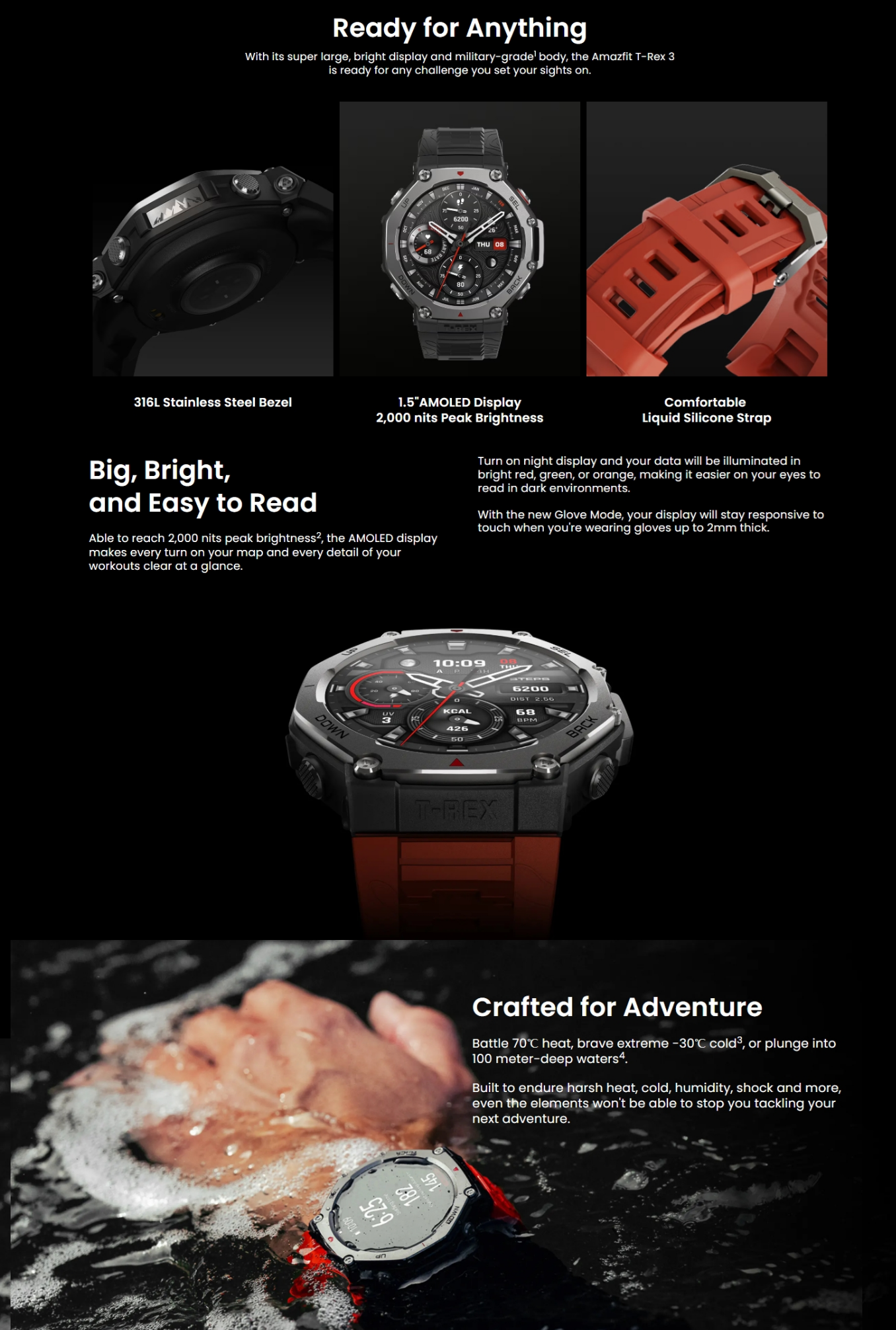 Amazfit T-Rex 3 พร้อมสำหรับความท้าทายที่คุณตั้งเป้าไว้ ขนาดใหญ่ สว่าง และอ่านง่าย หน้าจอ AMOLED ที่มีความสว่างสูงสุด 2,000 nits ทำให้ทุกการเลี้ยวบนแผนที่และทุกรายละเอียดของการออกกำลังกายของคุณชัดเจนในทันที เมื่อใช้งานตอนกลางคืน หน้าจอข้อมูลของคุณจะสว่างขึ้นเป็นสีแดง เขียว หรือส้มสดใส ทำให้อ่านได้สบายตาในสภาพแวดล้อมที่มืด และด้วย Glove Mode ใหม่ หน้าจอของคุณจะตอบสนองต่อการสัมผัสเมื่อคุณสวมถุงมือที่มีความหนาไม่เกิน 2 มม.