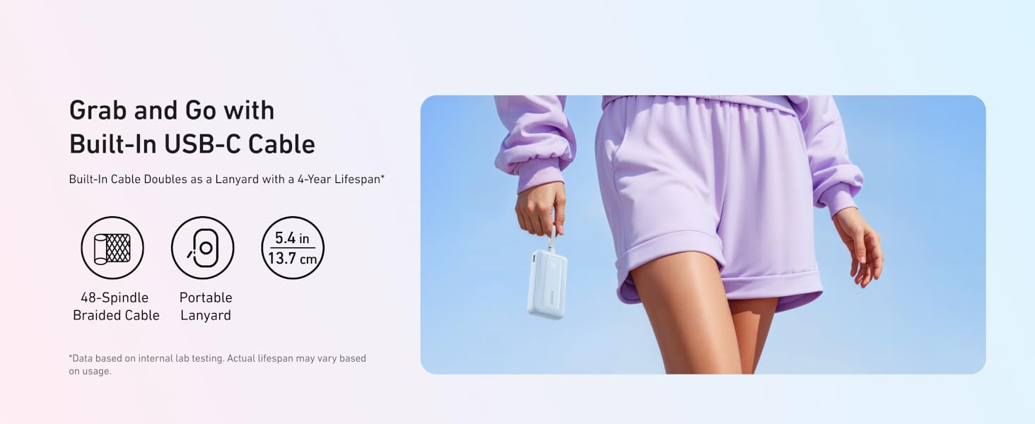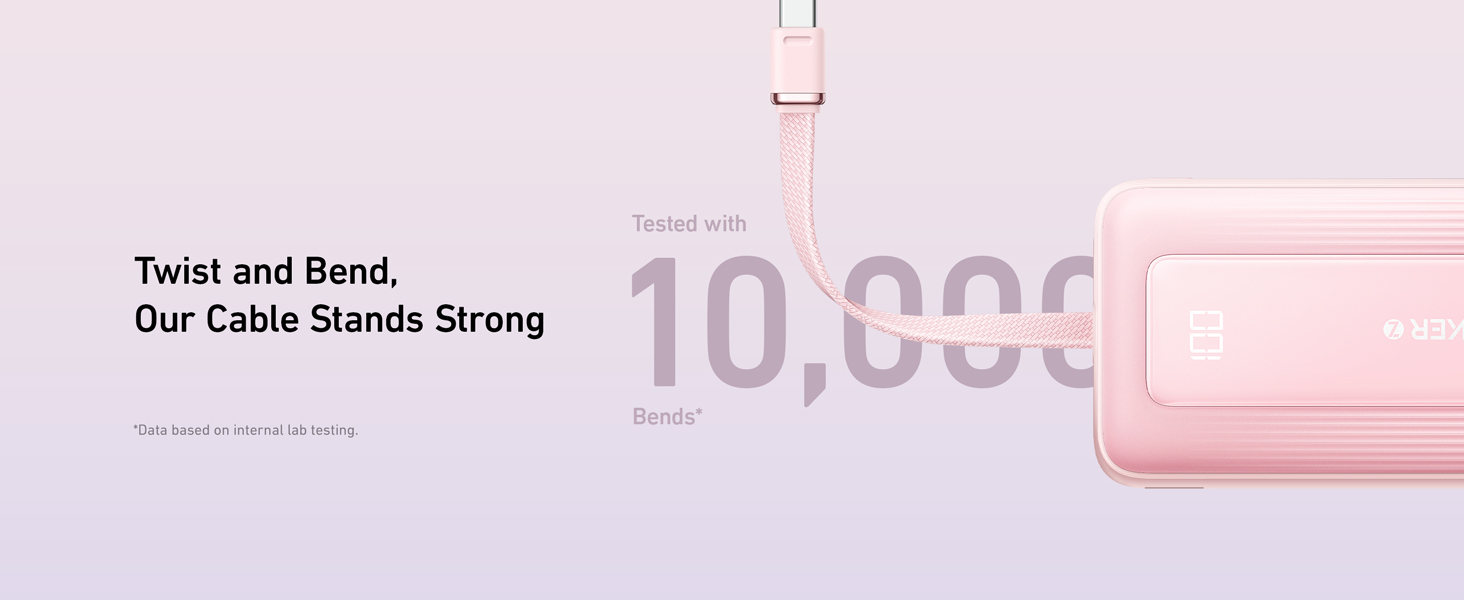ออกแบบมาเพื่อความทนทาน สาย USB-C ในตัวขนาด 5.4 นิ้วของเราผ่านการทดสอบมาแล้วว่าสามารถทนทานต่อการบิดงอได้มากกว่า 10,000 ครั้ง ทำให้มั่นใจได้ว่าจะสามารถรองรับการใช้งานในชีวิตประจำวันได้อย่างสมบุกสมบัน