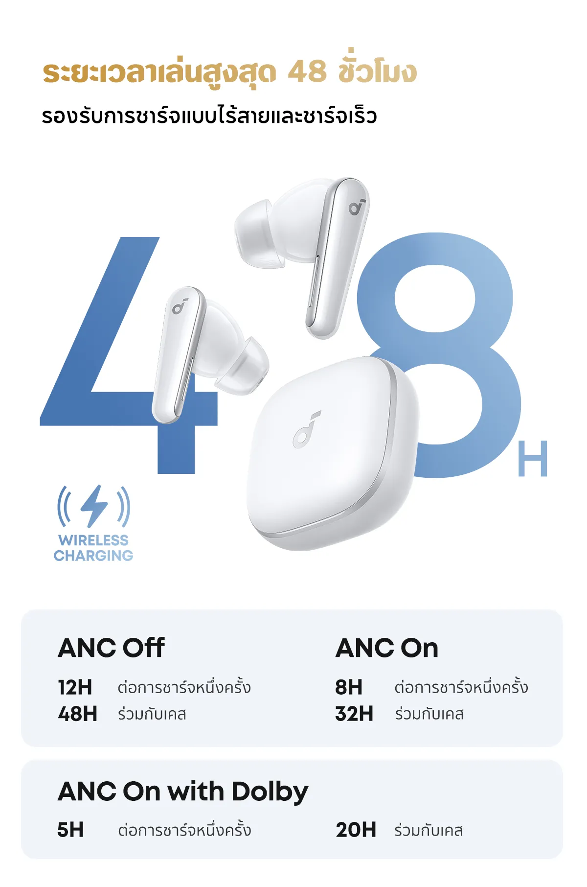 💠 รวมกับเคส: สูงสุด 48 ชั่วโมง (ปิด ANC), หรือ 32 ชั่วโมง (เปิด ANC)