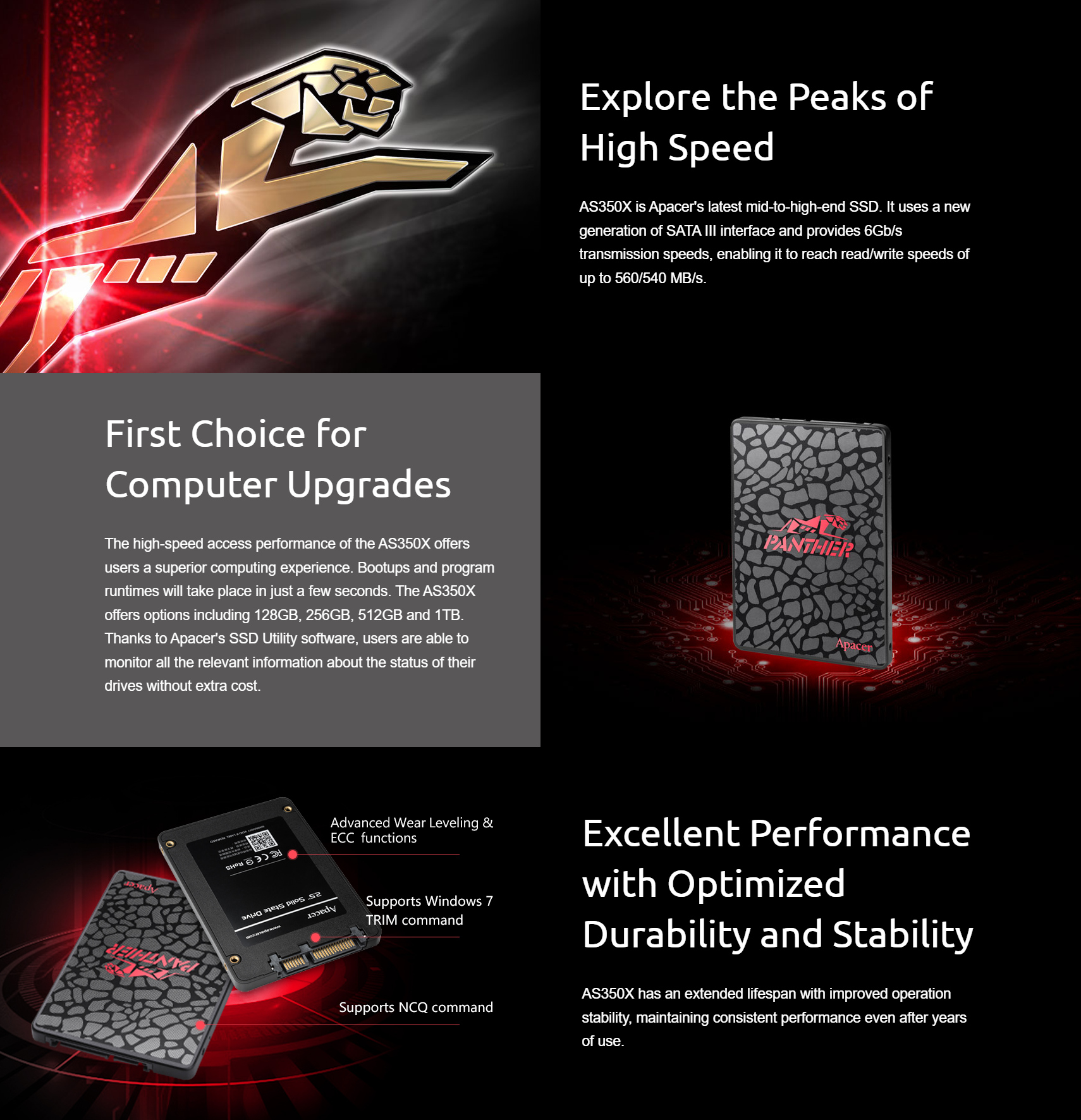 AS350X is Apacer’s latest mid-to-high-end SSD. It uses a new generation of SATA III interface and provides 6Gb/s transmission speeds, enabling it to reach read/write speeds of up to 560/540 MB/s.