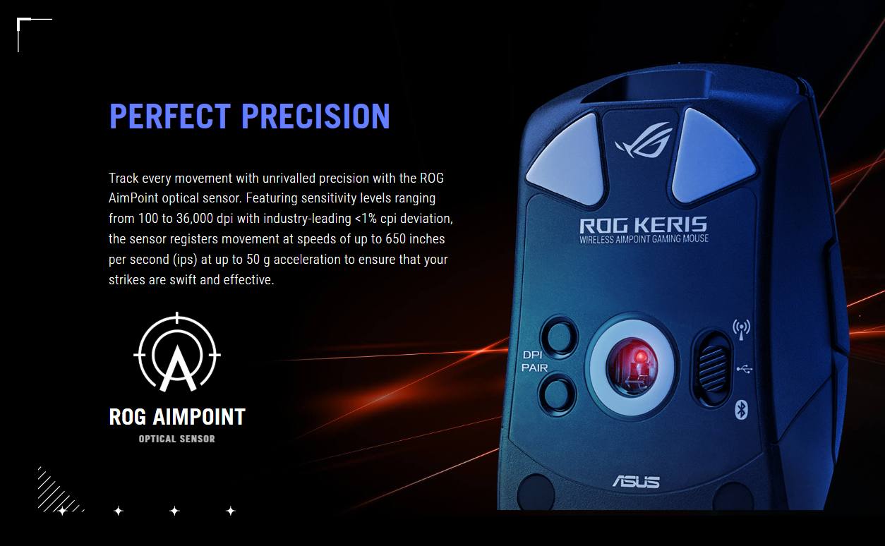 ✅ เซ็นเซอร์ออปติคอล ROG AimPoint Pro: เซ็นเซอร์ออปติคอล 36,000 dpi พร้อมเทคโนโลยี track-on-glass