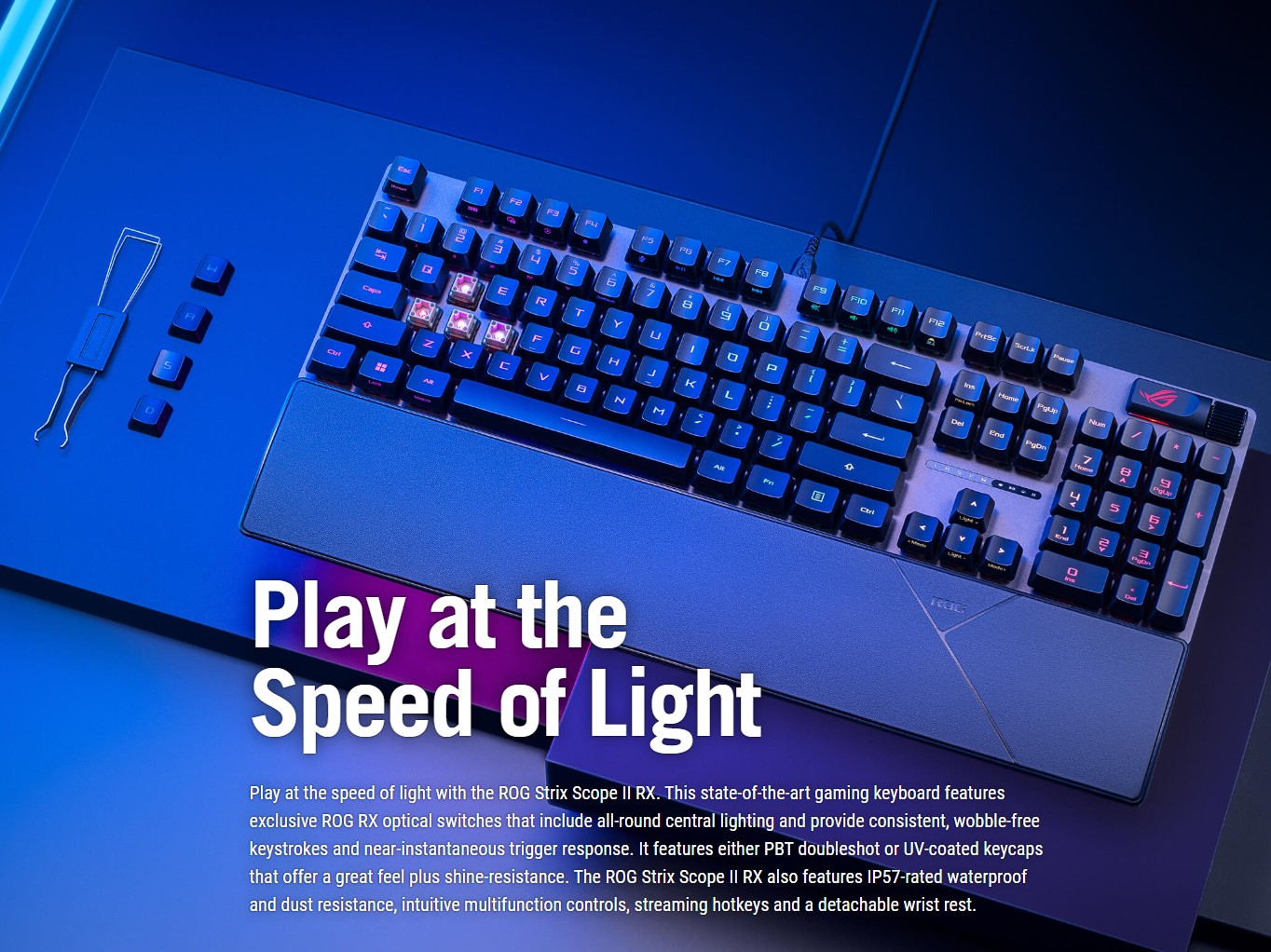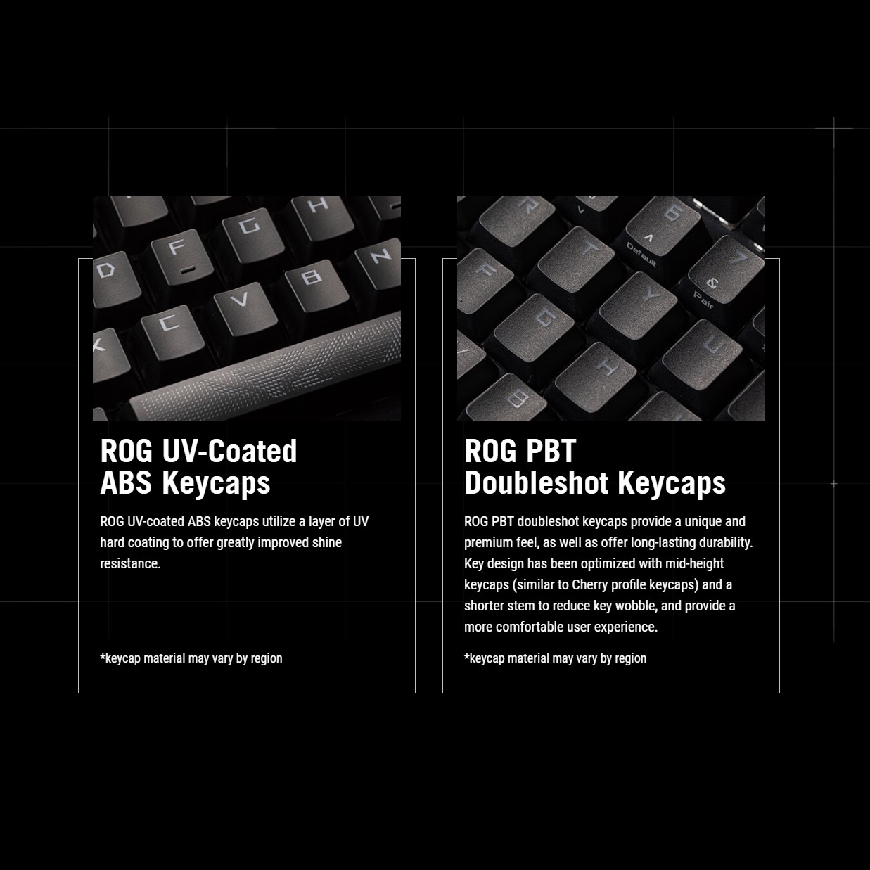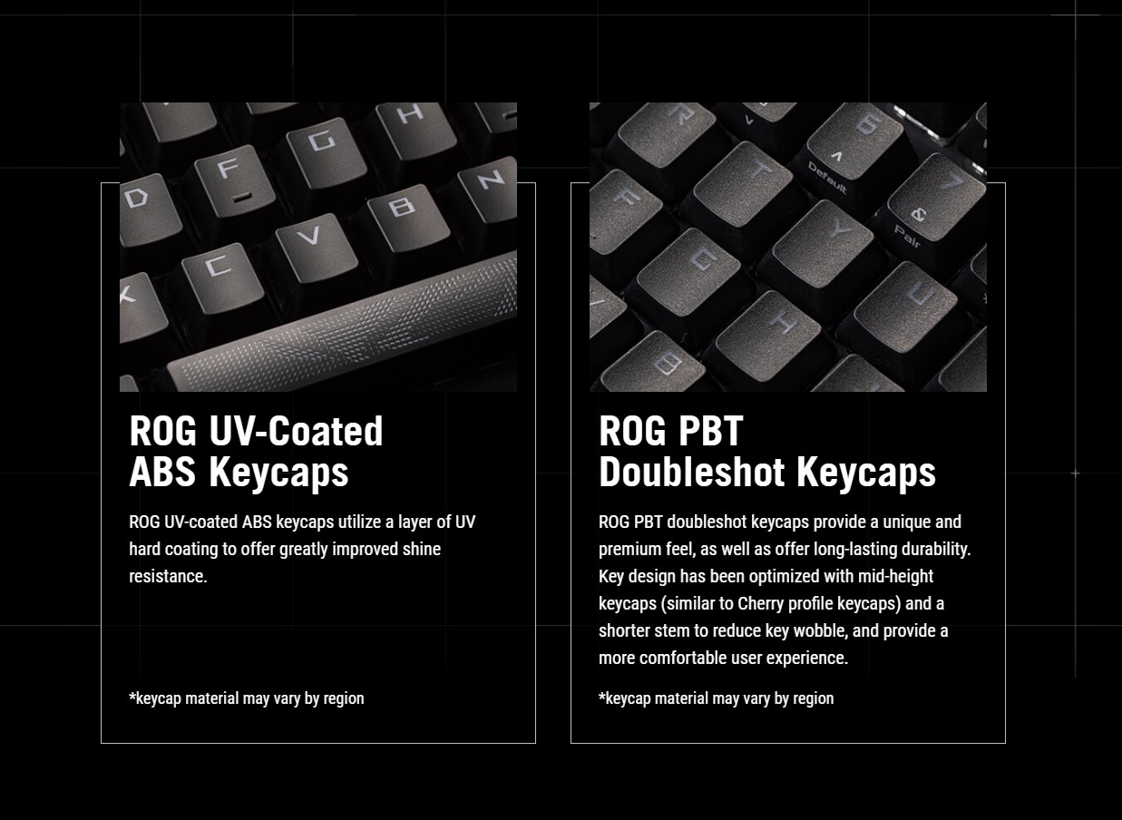 ❇️ คีย์แคป ROG PBT แบบ Doubleshot ที่ทนทาน หรือคีย์แคป ABS เคลือบ UV ให้สัมผัสระดับพรีเมียมและป้องกันการเกิดรอยเงา*