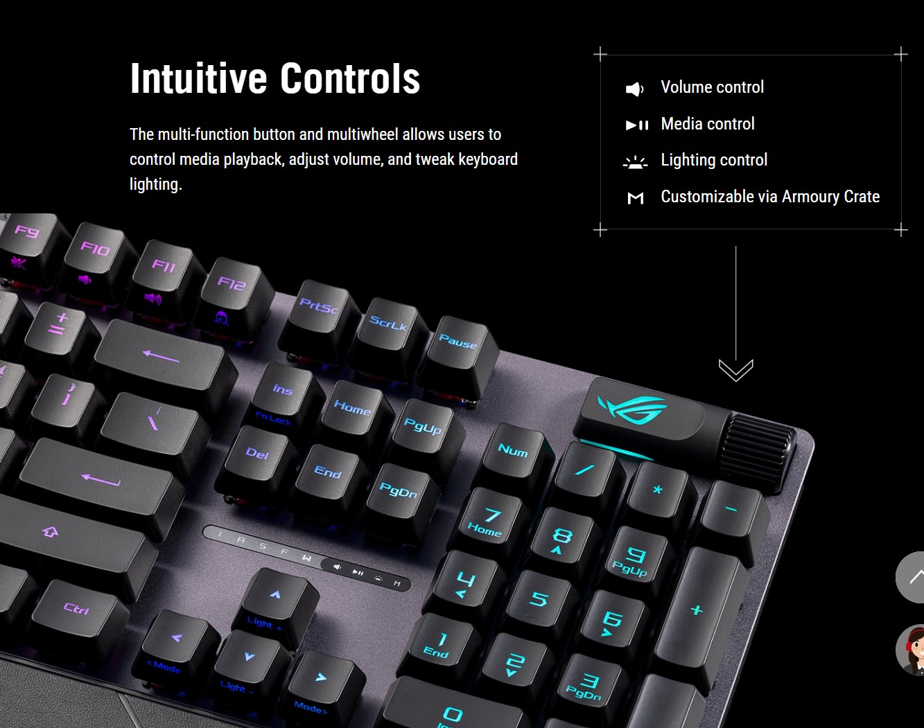 ❇️ การควบคุมที่ใช้งานง่าย: ปุ่มมัลติฟังก์ชันและปุ่มหมุนสามทาง สำหรับควบคุมการเล่นสื่อ, ปรับระดับเสียง และปรับแสงไฟคีย์บอร์ด
