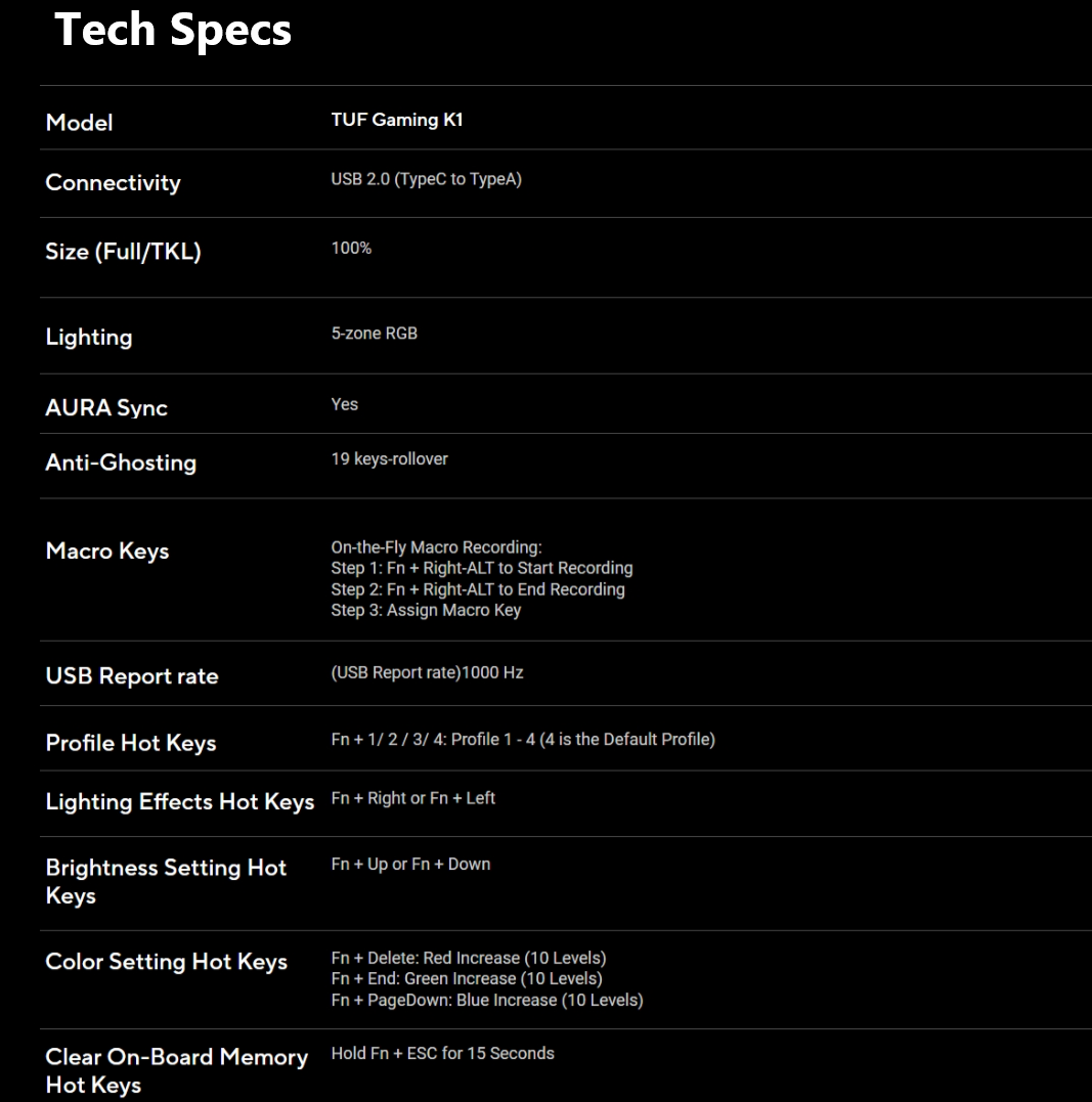 💠 Profile Hot Keys – Fn + 1/ 2 / 3/ 4: Profile 1 – 4 (4 is the Default Profile)