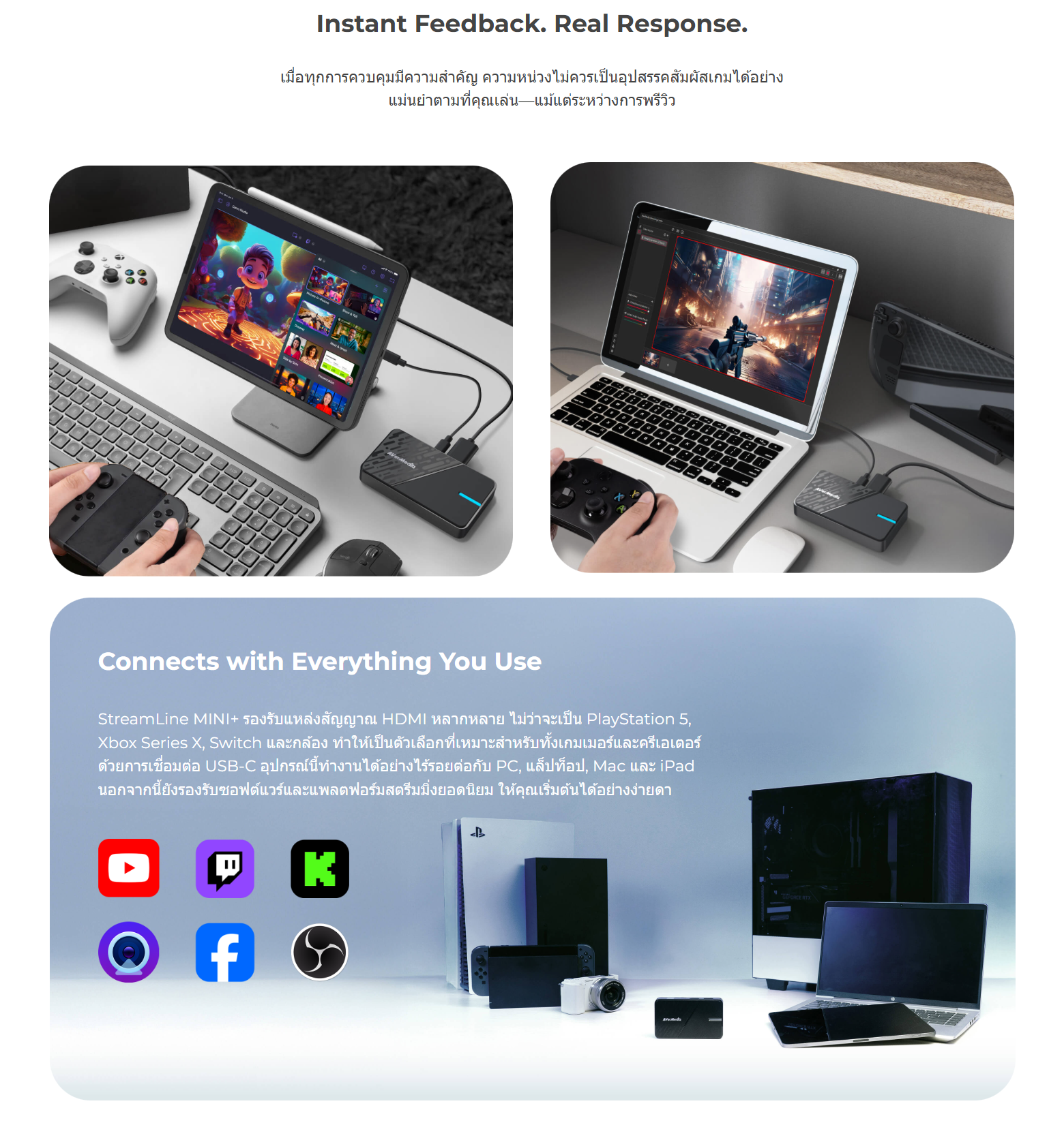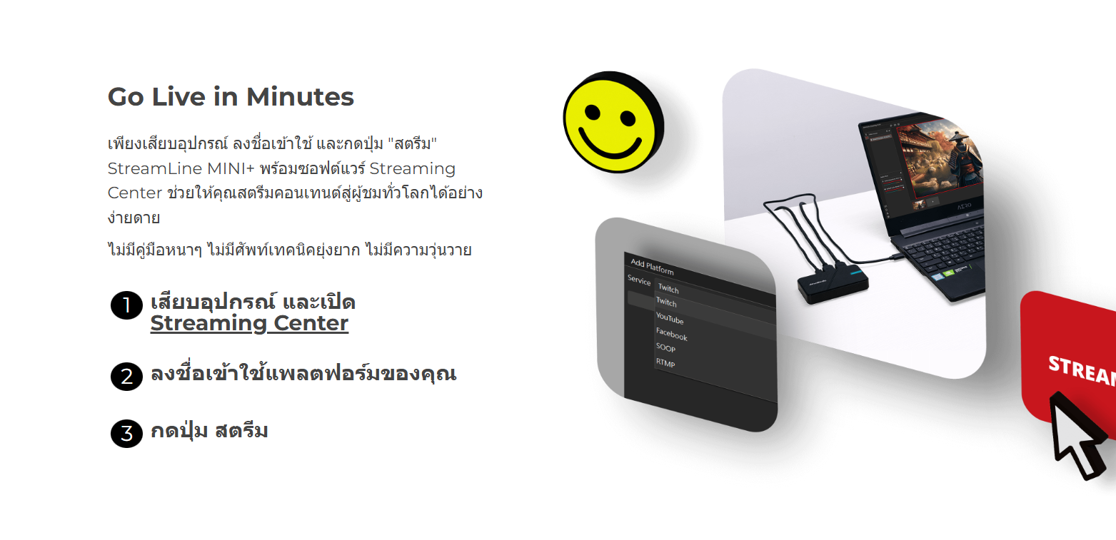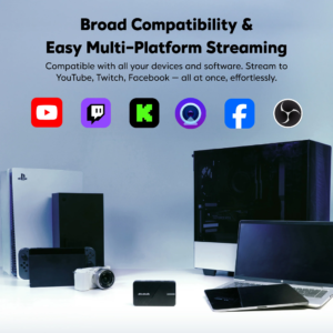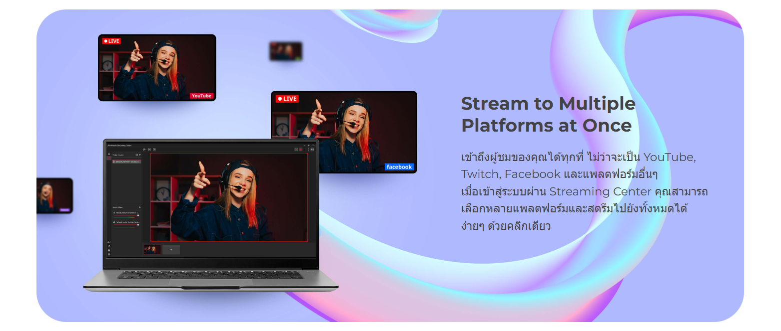 ✅ ลองรับการสตรีมหลายแพลตฟอร์มพร้อมกัน เช่น Youtube, Twitch, Facebook เป็นต้น (ใช้ร่วมกับโปรแกรม Avermedia Streaming Center)
