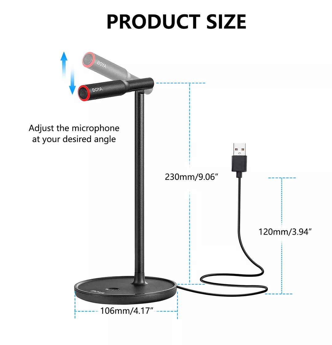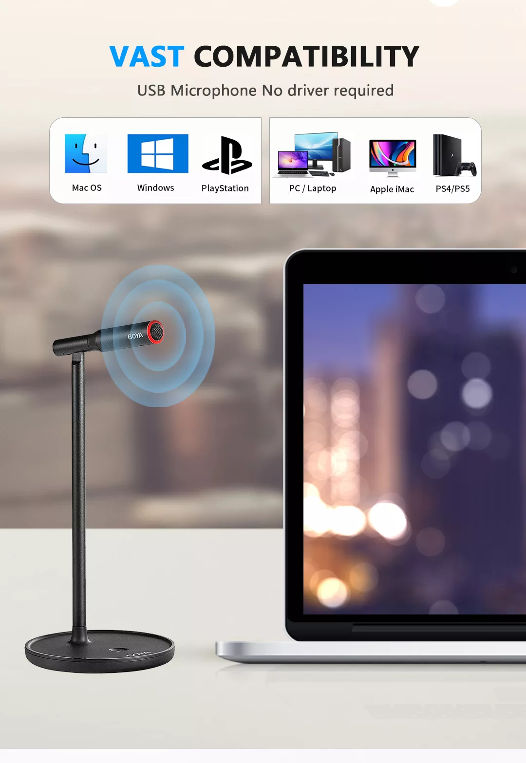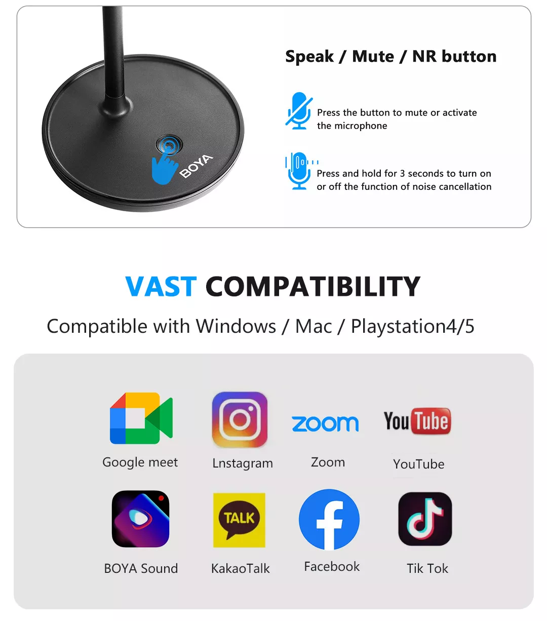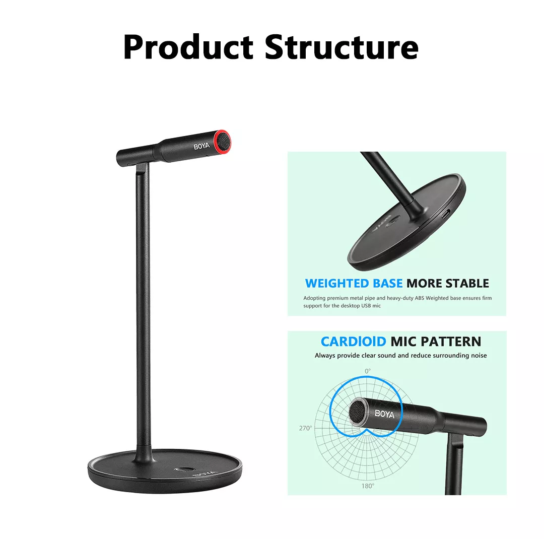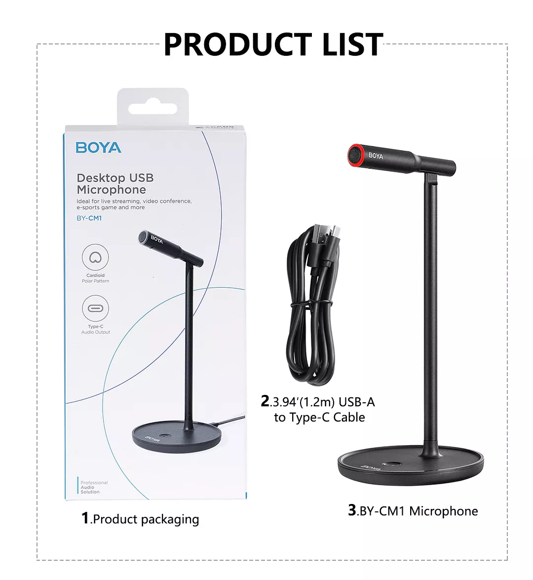 BOYA BY-CM1 ไมโครโฟน USB สำหรับเดสก์ท็อป BY-CM1 เป็นไมโครโฟนประเภทหนึ่งที่สามารถเชื่อมต่อกับคอมพิวเตอร์หรืออุปกรณ์อื่นๆ ผ่านพอร์ต USB ทำให้สะดวกในการใช้งานกับการสตรีมสด การประชุมทางวิดีโอ เกม e-sports หรือกิจกรรมอื่น ๆ ที่ต้องการการบันทึกเสียงคุณภาพสูง