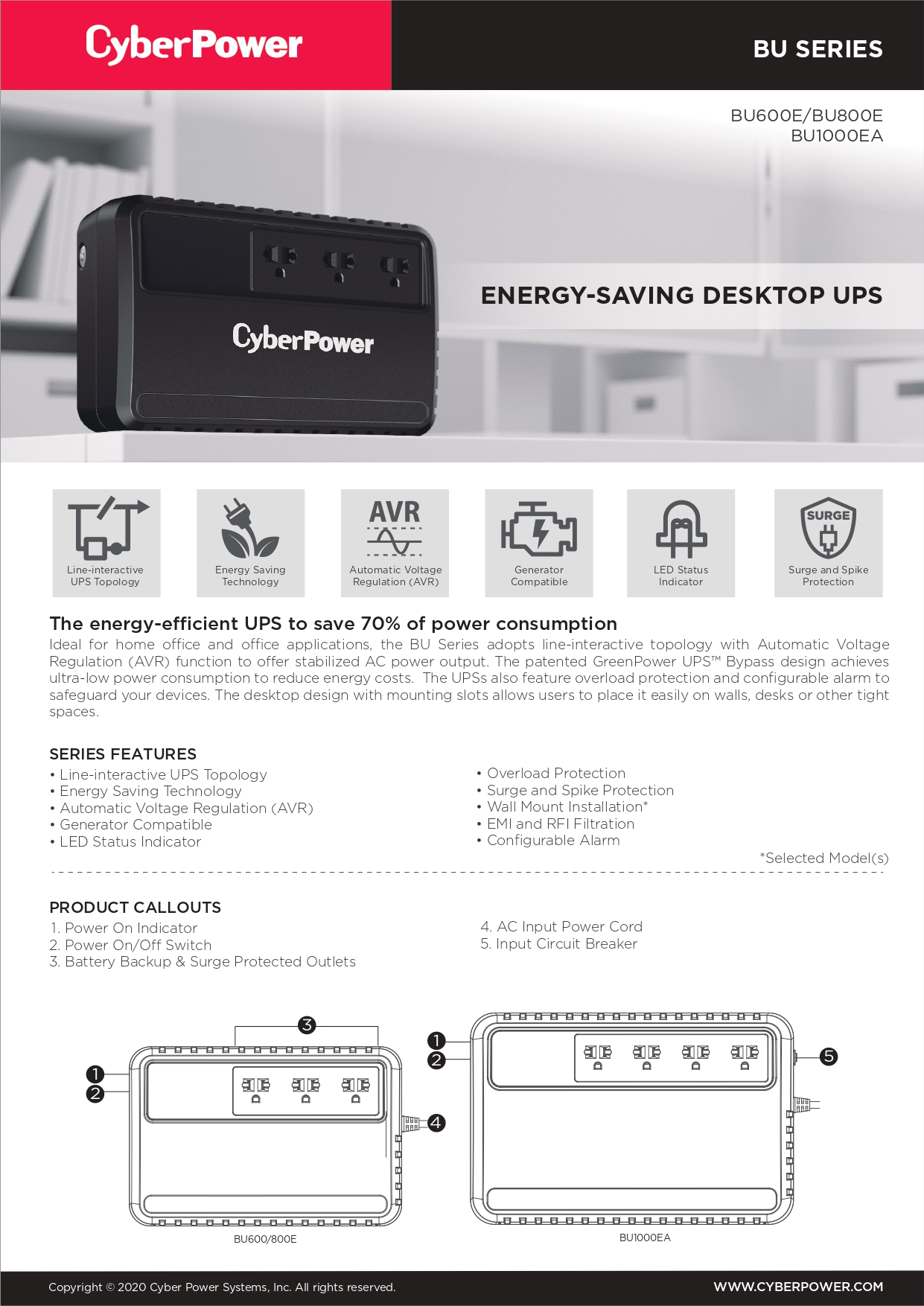 เครื่องสำรองไฟฟ้าแบรนด์ CyberPower มีกลุ่มสินค้า BU Series ที่ออกแบบให้เหมาะกับการใช้งานภายในบ้าน สำนักงานออฟฟิศทั่วไป กล้อง CCTV เน้นอุปกรณ์ไอทีขนาดเล็กทั่วไป โดยในซีรีส์ประกอบด้วยรุ่น BU600E / BU800E / BU1000EA / BU800ELCD / BU1000ELCD มาพร้อมฟังก์ชั่นจำเป็นพื้นฐานที่ตอบสนองการใช้งานที่คุ้มค่า