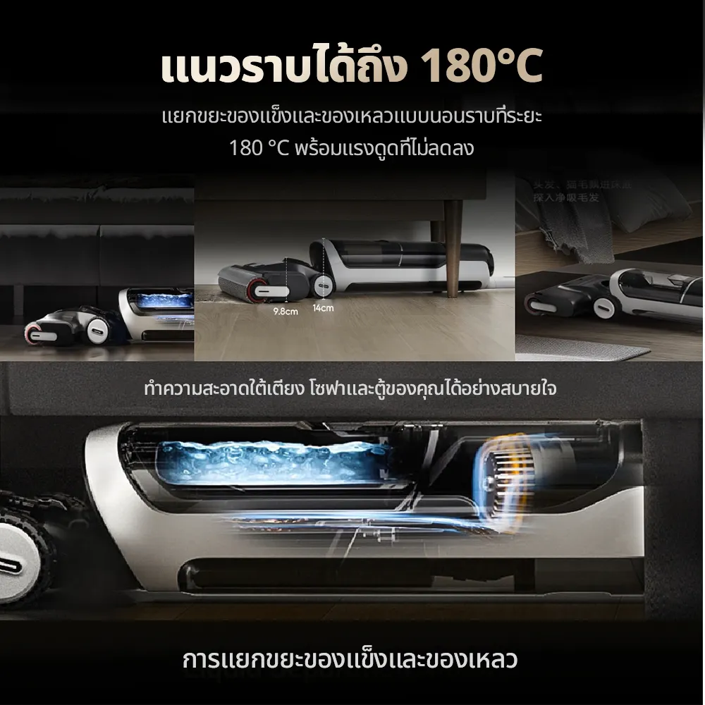 ✅ สามารถกดตัวเครื่องให้ขนานไปกับพื้นได้ 180 องศา เพื่อเข้าถึงพื้นที่ที่เข้าถึงยาก เมื่อปรับนอนแล้ว ตัวเครื่องจะมีความสูง 14 ซม.