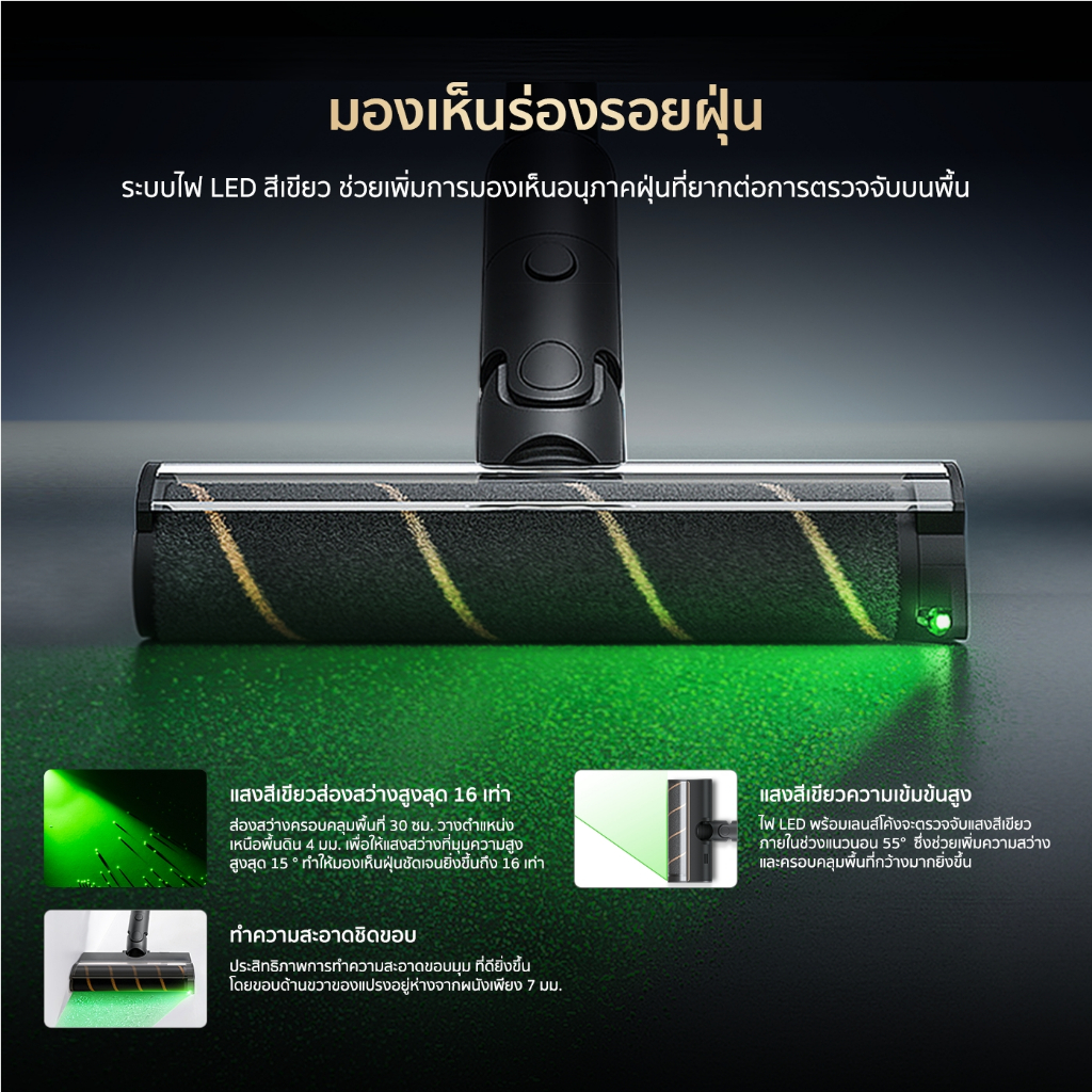 ✅ มีเทคโนโลยีแสงสีเขียว ทำให้เห็นฝุ่นได้ชัดมากขึ้นขณะดูดฝุ่น
