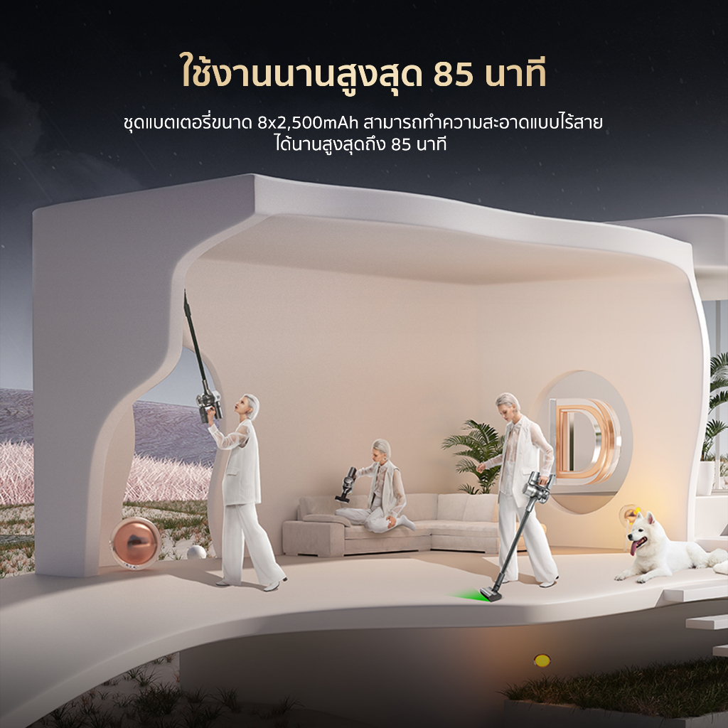 ชุดแบตเตอรี่ขนาด 8×2,500mAh สามารถทำความสะอาดแบบไร้สายได้นานสูงสุดถึง 85 นาที