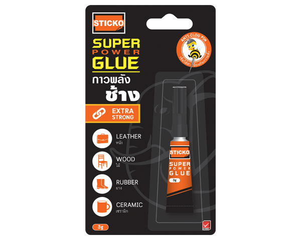 กาววิทยาศาสตร์STICKO 3G. จาก ตราช้าง กาวซุปเปอร์กูล เนื้อกาวคุณภาพ แห้งเร็วสุดยอด ติดแน่นทนนาน มาพร้อมกับฝาเกลียวล็อคสองชั้น ปิดสนิท ป้องกันการไหลเปื้อนบริเวณปาก การใช้งานก็ทำได้ง่ายเพียงแค่หมุนโดยไม่ต้องใช้เข็มเจาะเวลาใช้ครั้งแรก รวมทั้งมีเหล็กในใต้ฝาลดปัญหาแห้งคาปล่อยหลอด สามารถเก็บไว้ใช้ได้หลายครั้งจนหมดหลอด กาวรุ่นนี้เป็นกาวที่สามารถใช้ได้กับงานหลายหลากพื้นผิว ไม่ว่าจะเป็น โลหะ พลาสติก ยาง หนัง เซรามิค ไม้ กระเบื้อง ซึ่งสามารถติดได้อย่างทนนาน