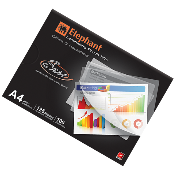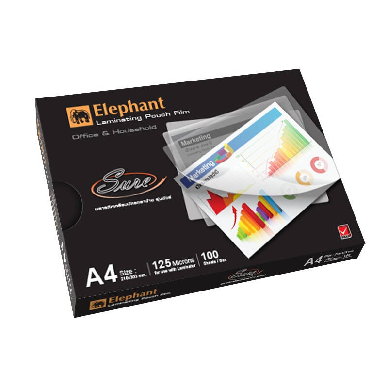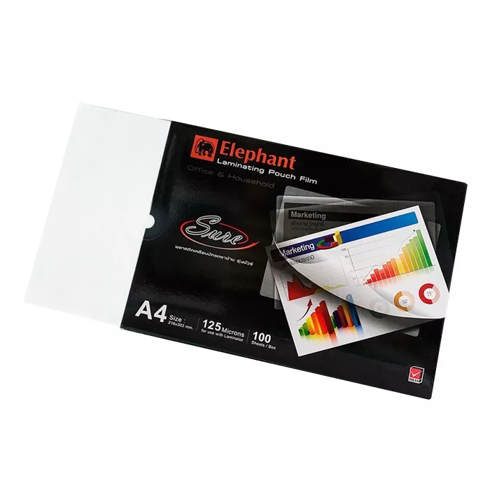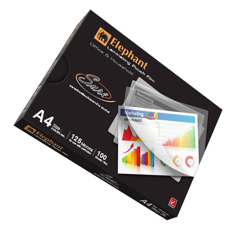 ฟิล์มเคลือบบัตรSURE A4 125MIC. ตราช้าง พลาสติกเคลือบบัตรที่มีความหนา 125 ไมครอน ช่วยป้องกันเอกสารที่เคลือบจาก สิ่งสกปรก น้ำ และช่วยให้เอกสารนั้นไม่ยับ ดูใหม่อยู่ตลอดเวลาอีกด้วย ฟิล์มสามารถติดได้ดีแนบแน่นกับเอกสาร ไม่เกิดฟองอากาศ เหมาะสำหรับการใช้เคลือบเอกสารสำคัญต่างๆเช่น สูติบัตร, ใบจดทะเบียนบริษัท หรือ ใบประกาศต่างๆ ฟิล์มเคลือบบัตรรุ่นนี้จะช่วยให้เอกสารของคุณยืดอายุการใช้งานได้เป็นอย่างดี