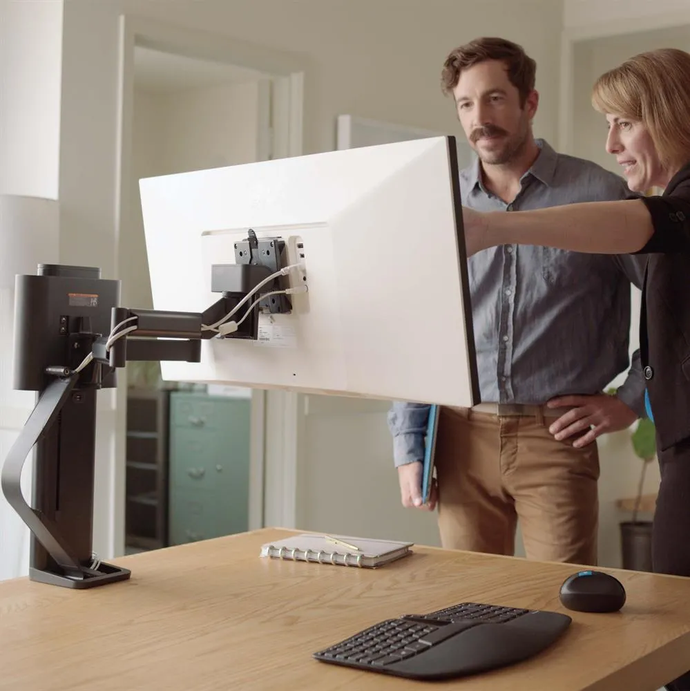 Includes lift column, extension arms, cable management channel, pivot, base, 2-piece desk clamp, VESA spacer, mounting hardware