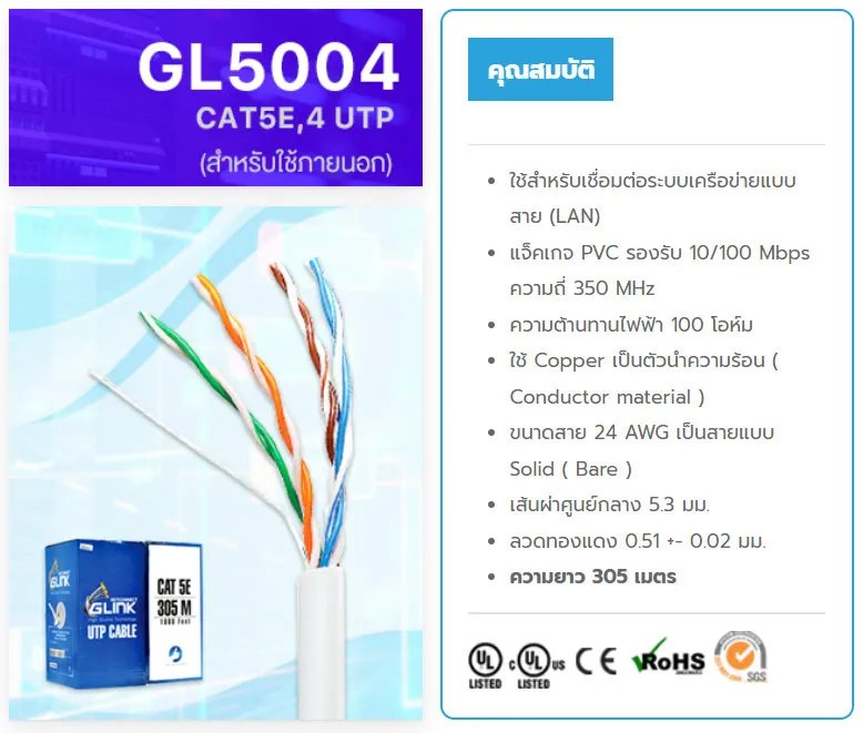 สายแลน GL5004 แบบใช้งานภายในอาคาร เปลือกหุ้มสายด้านนอก PVC สีขาว, สายภายในเปลือกหุ้มวัสดุ HDPE เป็นลวดทองแดงขนาดตัวนำไฟฟ้า 0.50 CCA สายบิดเกลียวไม่มีเปลือกหุ้ม สายมีขนาดเส้นผ่าศูนย์กลาง 5.3 มม. ความยาวสาย 305 เมตร บรรจุภายในกล่องแบบ Pull Box สะดวกและง่ายในการดึงสายออกมาใช้งาน