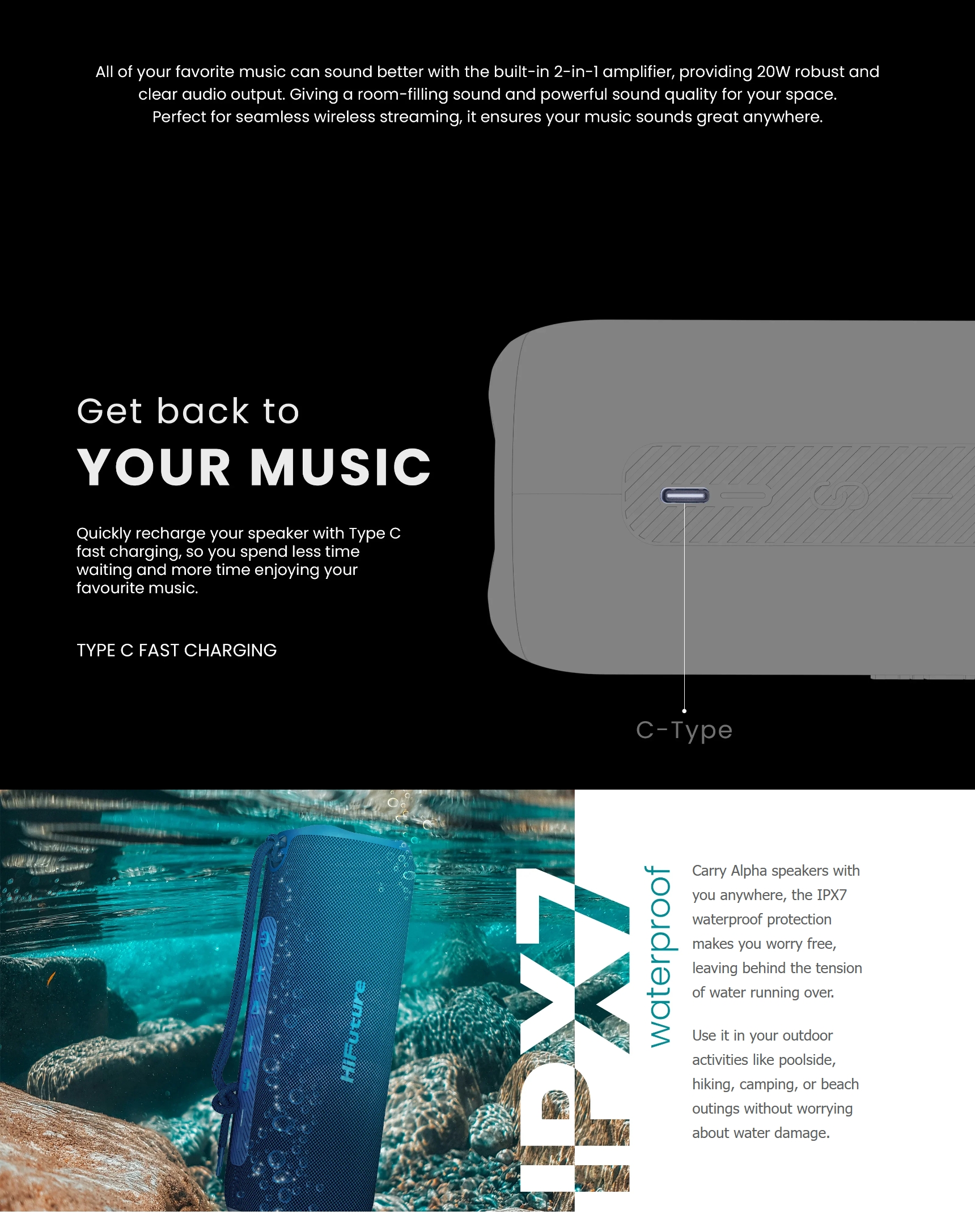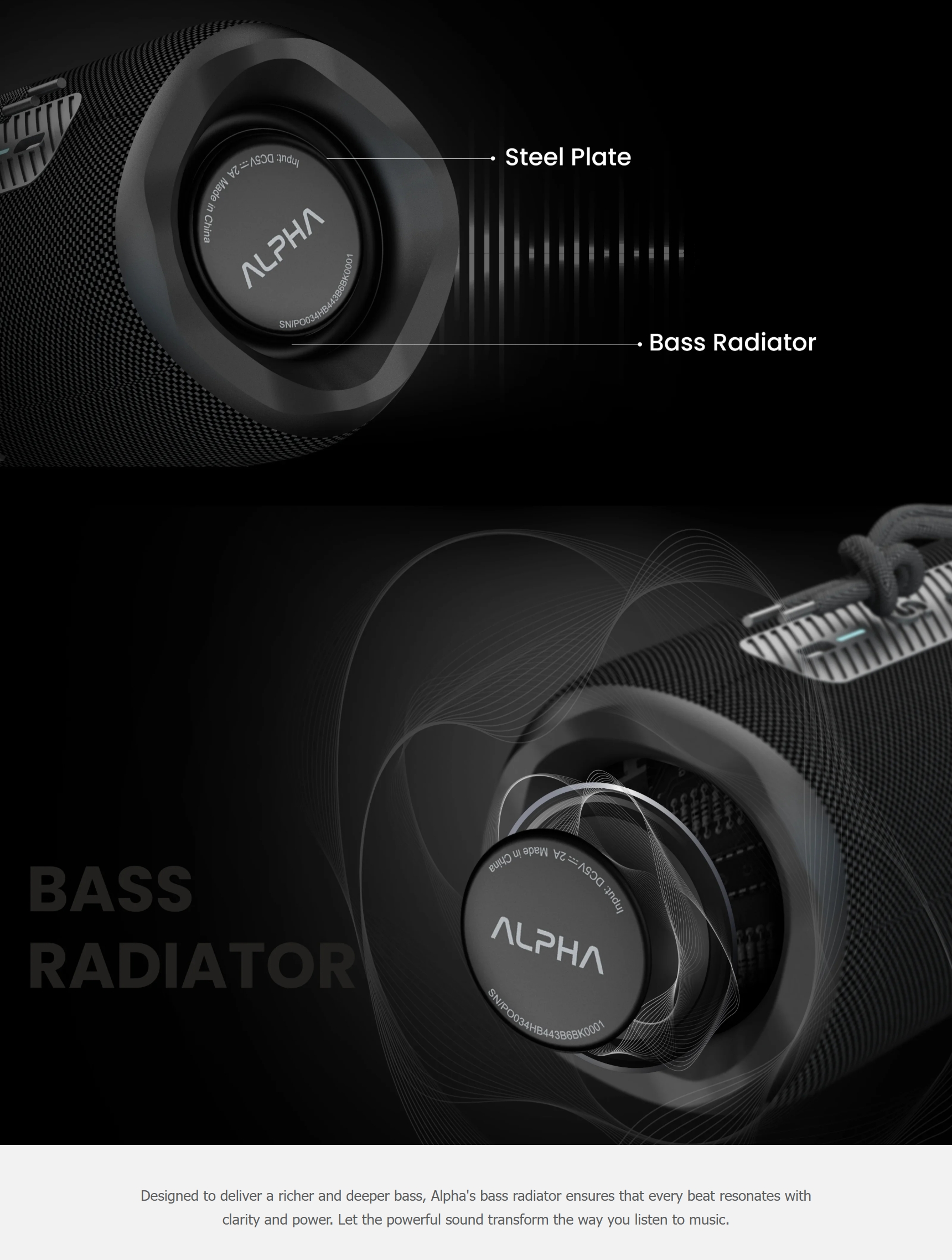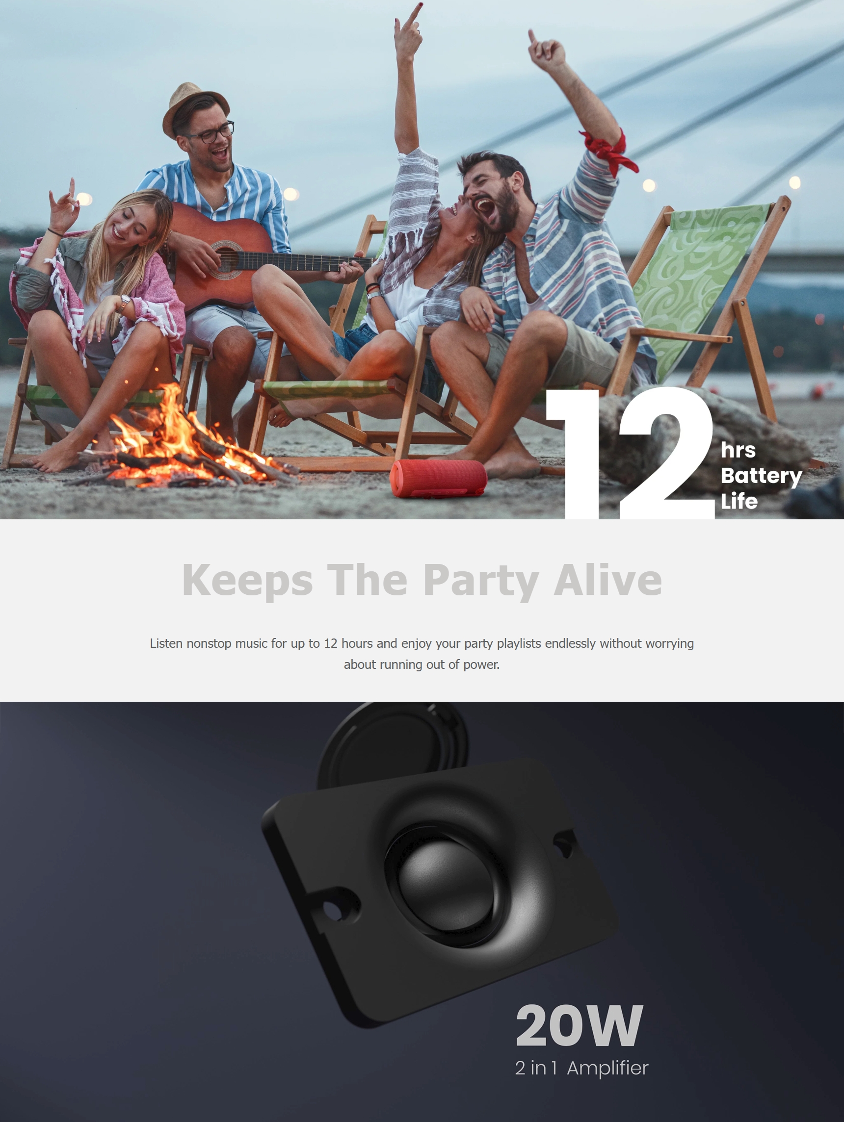✅ กำลังขับ 20W: ให้พลังเสียงที่ดังกระหึ่ม พร้อมด้วยแอมพลิฟายเออร์แบบ 2-in-1 และ Bass Radiator