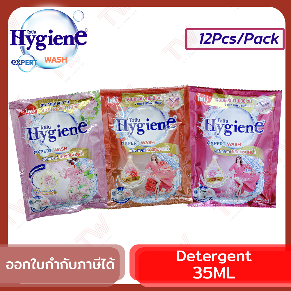 1️⃣ เทผลิตภัณฑ์ซักผ้าไฮยีน ชนิดน้ำ 1 ซอง (35 มล.) ในช่องสำหรับใส่ผลิตภัณฑ์ซักผ้า
