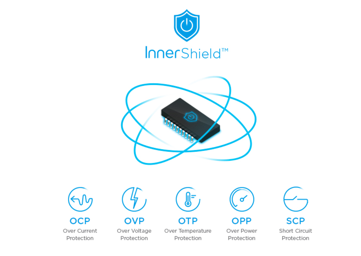 ผลิตภัณฑ์ Innergie ปลอดภัยกว่าที่เคย ด้วย 5 ระบบป้องกันอันตรายจากไฟฟ้าภายในตัวเครื่อง InnerShield™ ของ Innergie อุปกรณ์ทั้งหมดของคุณได้รับการปกป้องจาก กระแสไฟเกิน พลังงานเกิน แรงดันไฟฟ้าเกิน อุณหภูมิสูงเกิน และการลัดวงจร เพื่อให้พลังงานที่มีประสิทธิภาพ และความอุ่นใจในการใช้งาน