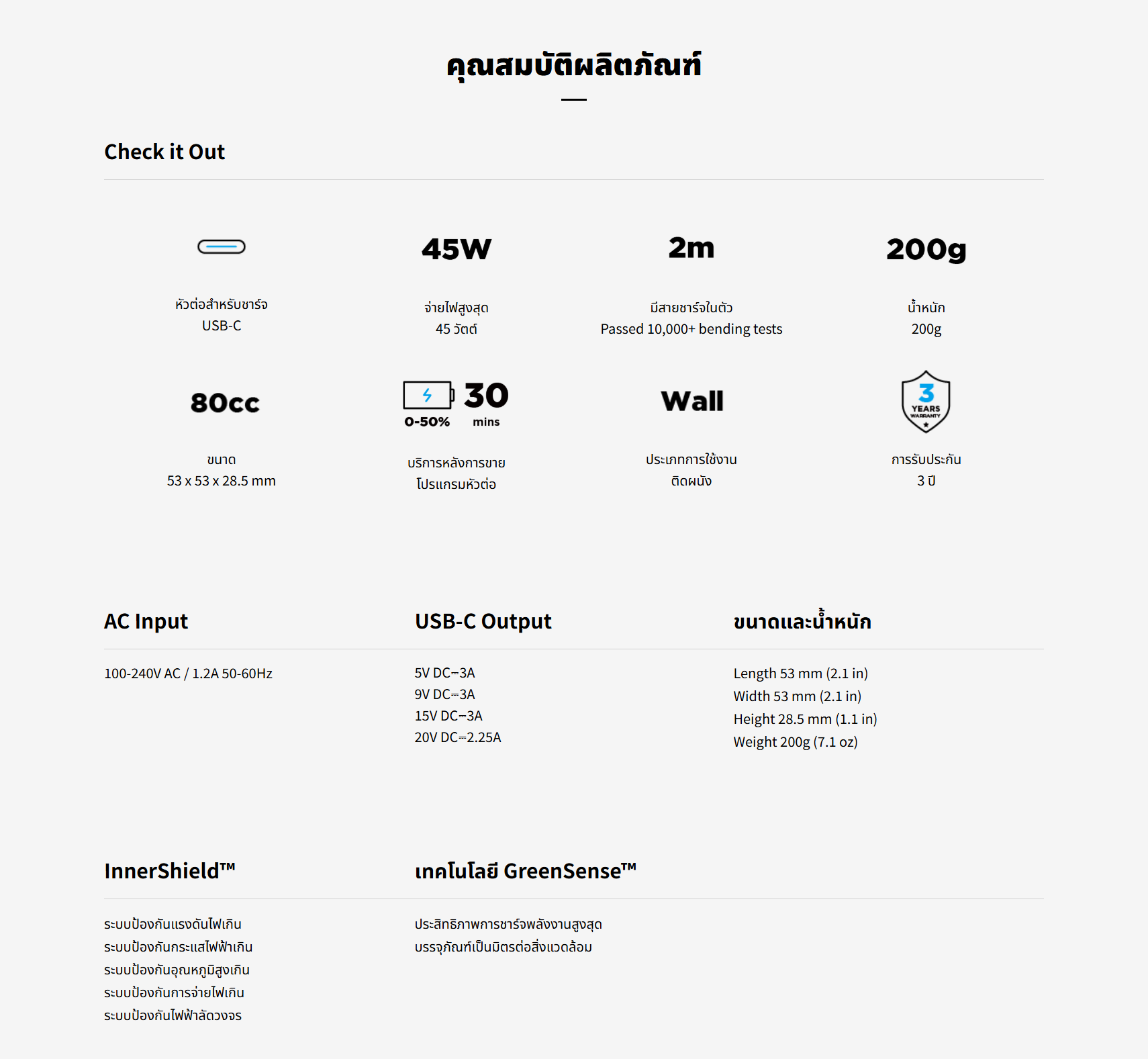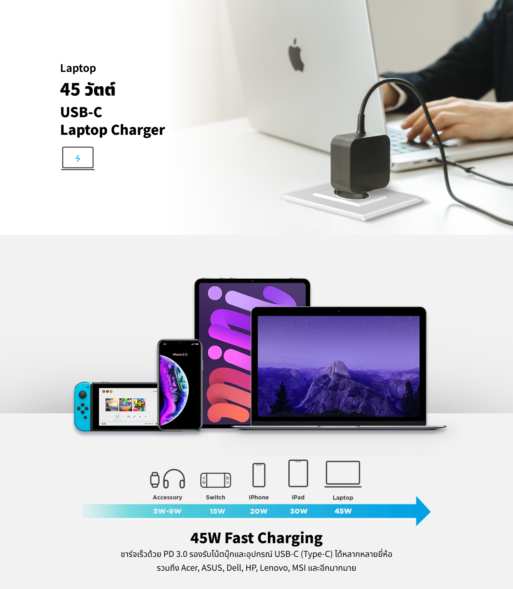 ✅ 45W Fast Charge: ชาร์จไวด้วยกำลังไฟสูงสุด 45 วัตต์ รองรับทั้ง iPhone, iPad, Android และ MacBook Air