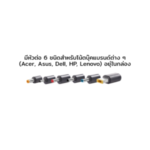 ❇️ มีหัวต่อ 6 ชนิดสำหรับโน้ตบุ๊คแบรนด์ต่าง ๆ (Acer, Asus, Dell, HP, Lenovo) อยุ่ในกล่อง