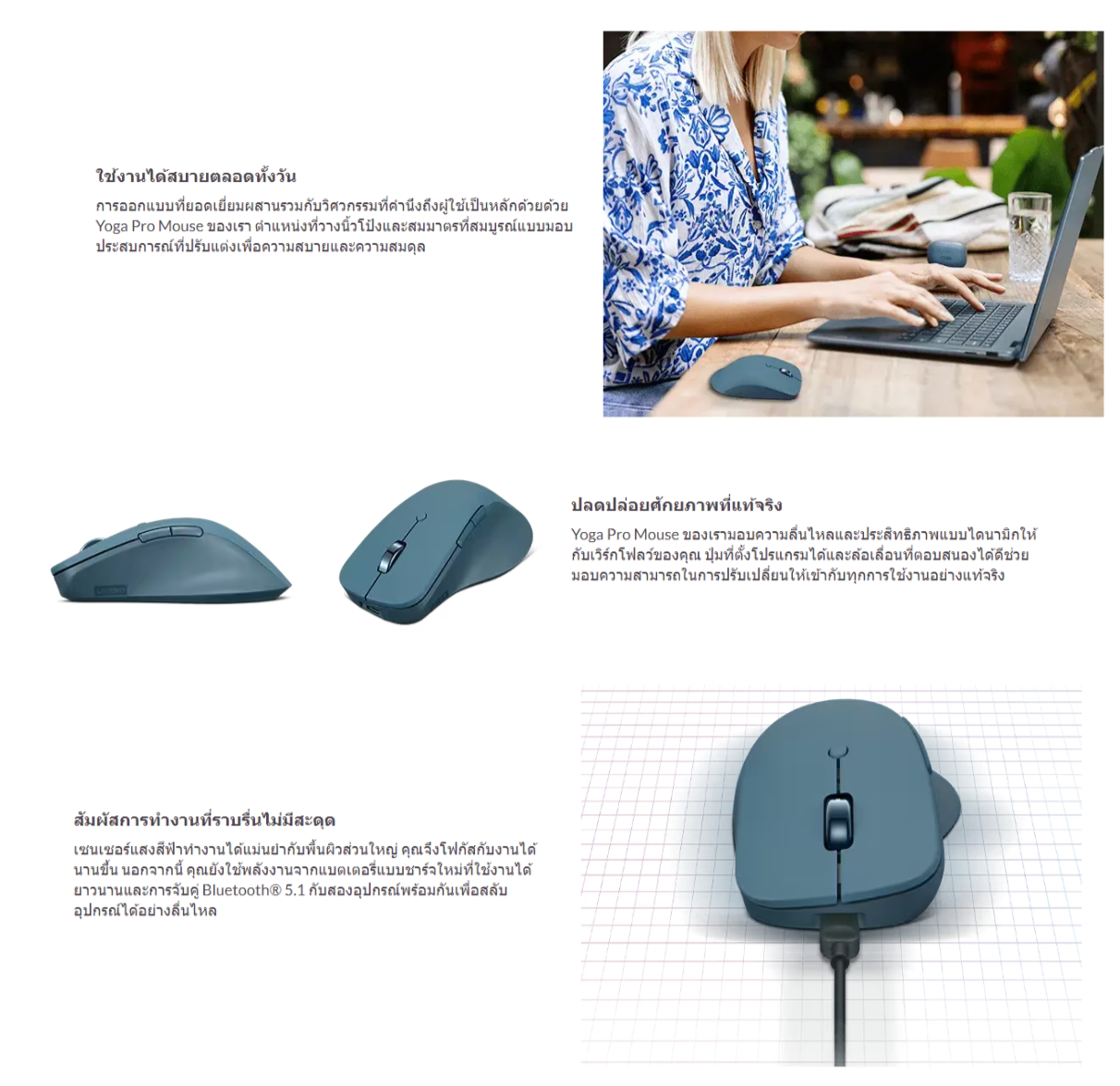 ยกระดับประสิทธิภาพการทำงานของคุณด้วย Yoga Pro Mouse ที่ออกแบบมาอย่างประณีตเพื่อเพิ่มประสิทธิภาพให้ผู้ถนัดมือขวา สัมผัสประสบการณ์การนำทางที่ราบรื่น ปุ่มที่ตั้งโปรแกรมได้เอง และล้อเลื่อนแบบไดนามิกที่จะประสานเข้ากับการเคลื่อนไหวของคุณ เมาส์นี้เติมเต็มแล็ปท็อป Yoga ของคุณได้อย่างสมบูรณ์แบบด้วยขุมพลังจากแบตเตอรี่ USB-C แบบชาร์จใหม่ได้ที่ทนทานสูงสำหรับการใช้งานยาวนานถึง 3 เดือน และการเชื่อมต่อ Bluetooth® สองโหมด ปรับเปลี่ยนพื้นที่ทำงานของคุณให้มีประสิทธิภาพด้วยอุปกรณ์ตามหลักการยศาสตร์ที่ยอดเยี่ยม ซึ่งสร้างขึ้นเพื่อเพิ่มศักยภาพของมนุษย์ในระดับสูงสุด