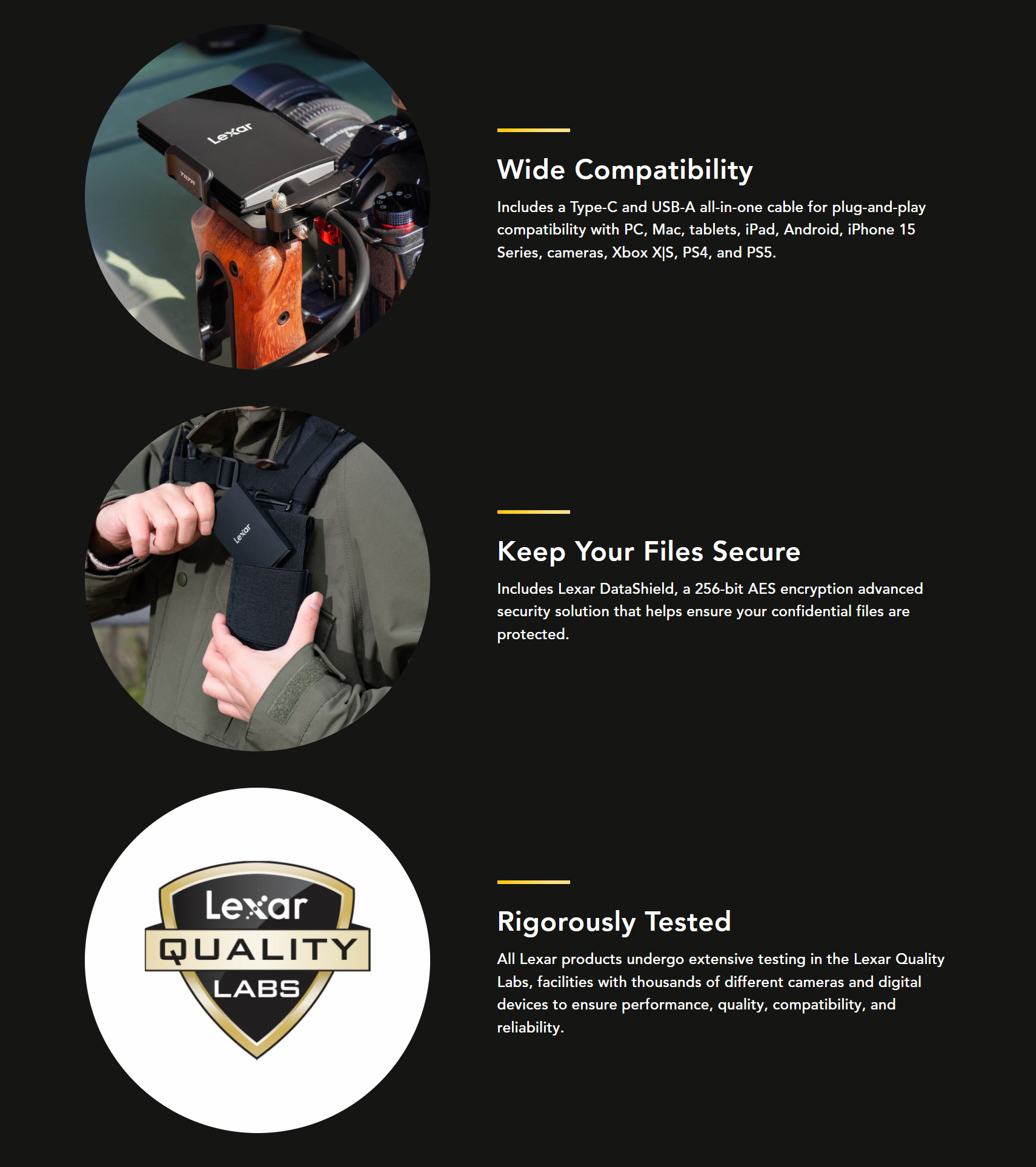 Includes Lexar DataShield, a 256-bit AES encryption advanced security solution that helps ensure your confidential files are protected.