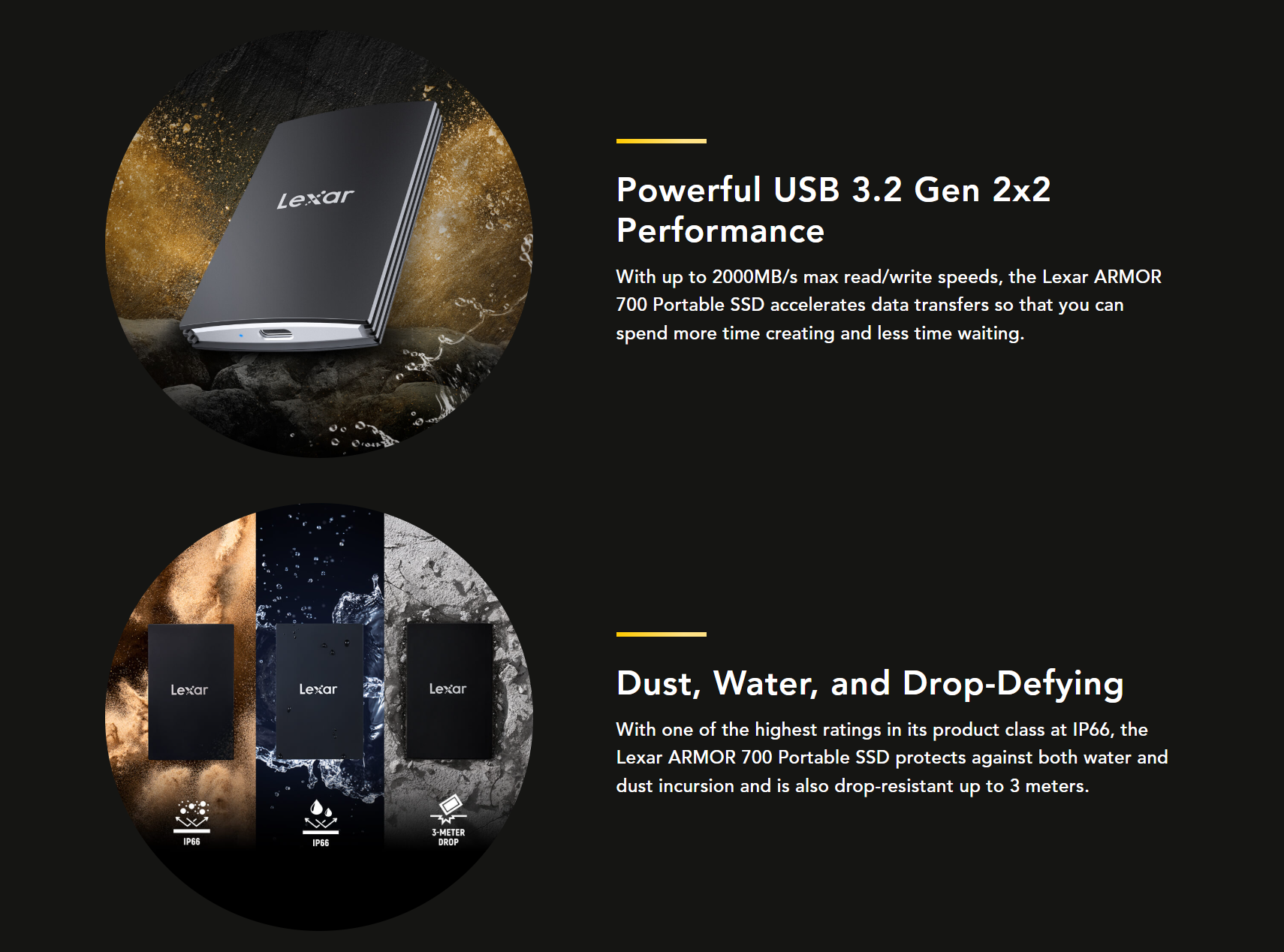 With one of the highest ratings in its product class at IP66, the Lexar ARMOR 700 Portable SSD protects against both water and dust incursion and is also drop-resistant up to 3 meters.
