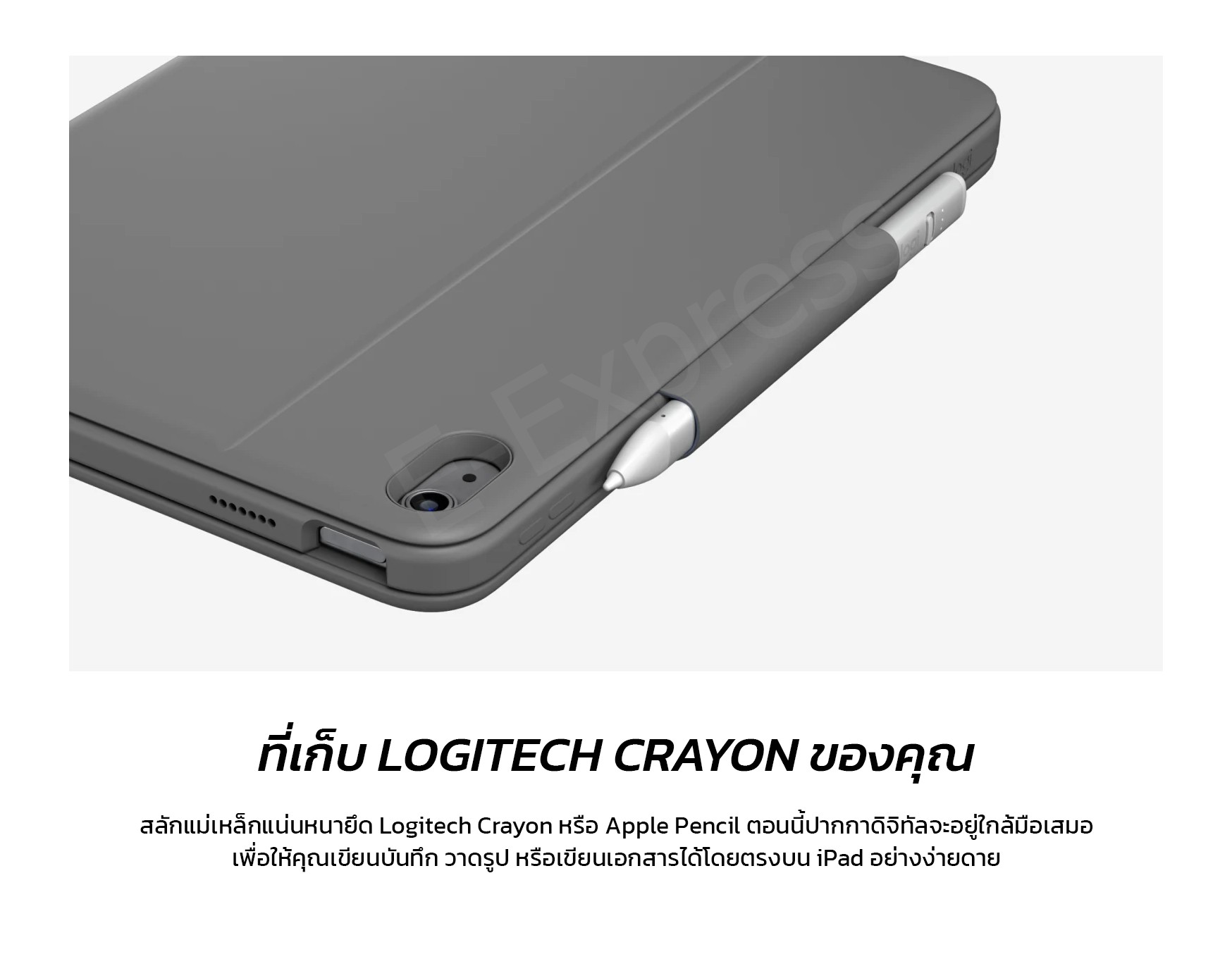 ✅ มีที่เสียบในตัวเพื่อจัดเก็บ Logitech Crayon หรือ Apple Pencil ด้วยสลักแม่เหล็กแน่นหนา