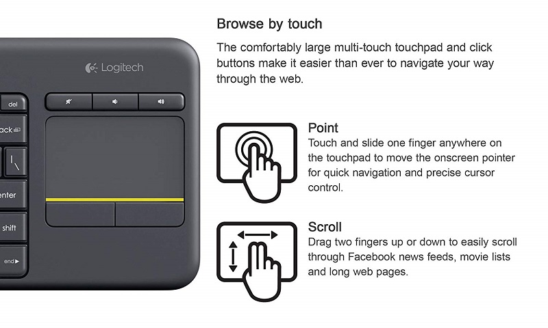 สนุกกับการควบคุมความบันเทิง PC-to-TV อย่างไร้รอยต่อ โดยไม่ต้องวุ่นวายกับคีย์บอร์ดและเมาส์ที่แยกต่างหากปุ่มที่ใช้งานได้อย่างสะดวกสบาย ไร้เสียงรบกวน พร้อมทัชแพดขนาดใหญ่ (3.5 นิ้ว) รองรับการควบคุมอย่างง่ายดาย