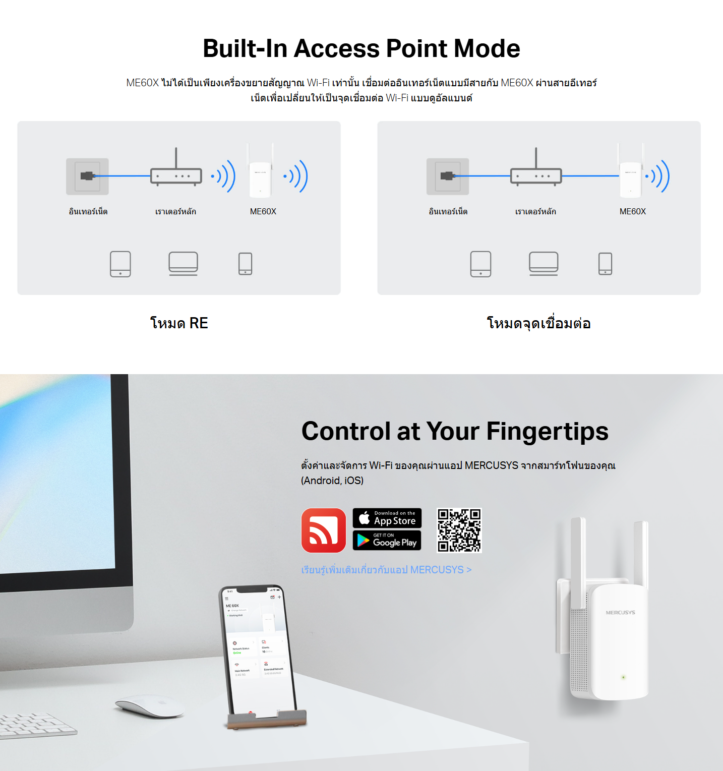 ✅ สามารถทำงานได้ทั้งโหมด Range Extender (ขยายสัญญาณ) และโหมด Access Point (AP) (เปลี่ยนการเชื่อมต่อมีสายให้เป็น Wi-Fi)