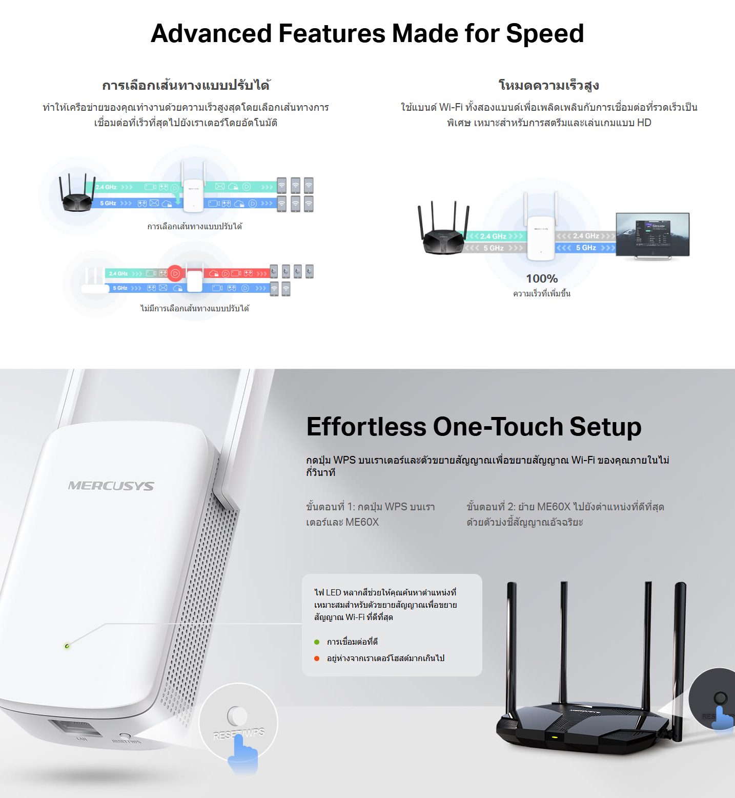 ✅ สามารถตั้งค่าและเชื่อมต่อกับเราเตอร์หลักได้อย่างง่ายดายด้วยการกดเพียงปุ่มเดียว (WPS) ภายในไม่กี่วินาที