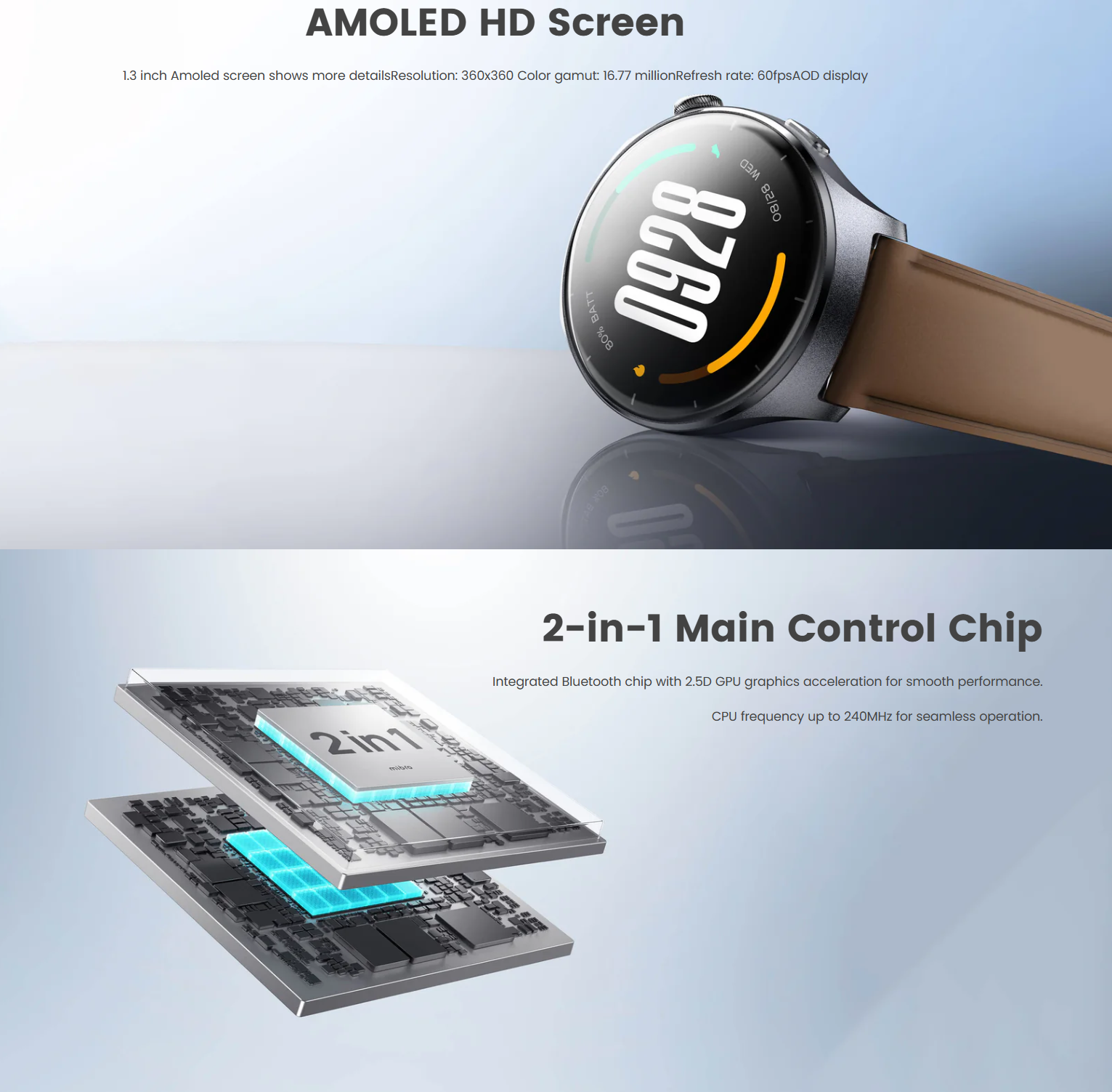 🔹 Display – 1.3″Amoled 360*360,AOD,PPI 277