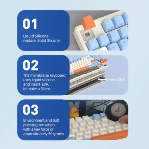 🔅🔅 Newest Key-Cap Design with Slience: The membrane keyboard uses liquid silicone, and insert EVA, to make a slient environment and soft pressing sensation with a key force of approximately 50 grams.