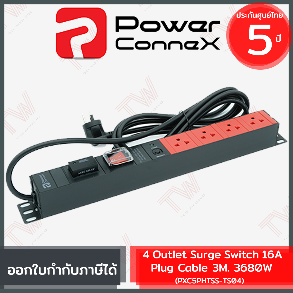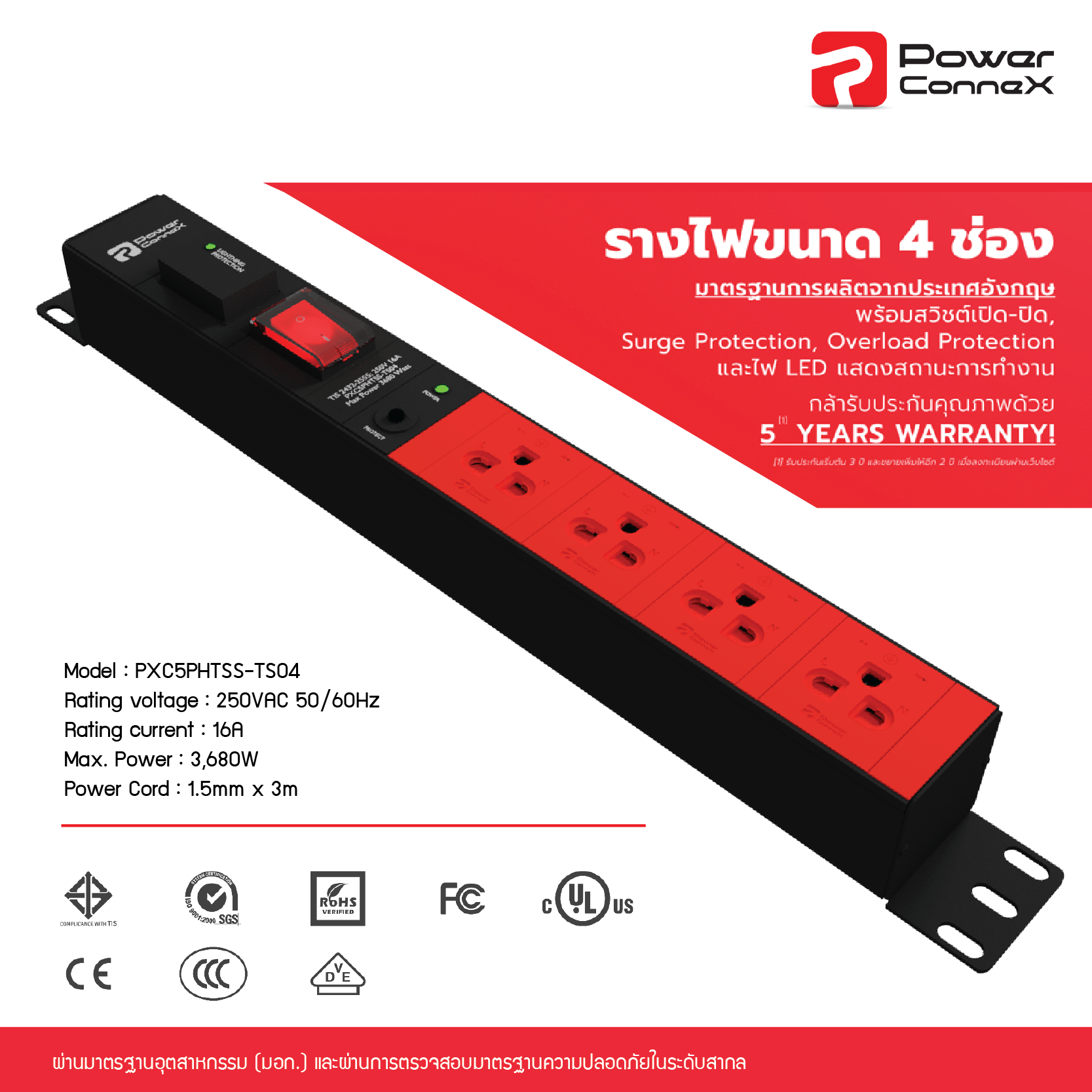 รางไฟคุณภาพ ขนาด 4 ช่อง แบบสวิชต์ + ป้องกันฟ้าผ่า 10000AC-PDU 4 x TIS outlet, with Surge Protection, Master Switch & Overload Protection, LED power indicator, TIS 16A Plug, Cable 3 mรางไฟมาตรฐานจากประเทศอังกฤษ ที่ได้รับความนิยมอย่างมากในประเทศไทย ณ ขณะนี้ เนื่องจากมีความปลอดภัย แข็งแรง ทนทาน ตอบโจทย์การใช้งานสำหรับ บ้านพักอาศัย หรือในอาคารสำนักงาน ที่ต้องการการต่อพ่วงไฟฟ้า โดยเฉพาะอย่างยิ่งสำหรับการใช้งานกับอุปกรณ์ที่ต้องการความปลอดภัย ความคงที่ของไฟฟ้าสูง อย่างเช่น เครื่องเสียง อุปกรณ์คอมพิวเตอร์ หรืออุปกรณ์ไฟฟ้าที่มีมูลค่าสูง เป็นต้นรางไฟรุ่น PXC5PHTSS-TS04 มาพร้อมเต้าเสียบมาตรฐาน มอก. จำนวน 4 ช่อง มีแผ่นกั้นการสัมผัสโดนภายในโดยตรง (Eyes Shutter) พร้อมสวิชต์ เปิด-ปิด, Surge Protection ป้องกันฟ้าผ่าและ Over-load protection ที่ช่วยปกป้องการใช้งานเกินกระแสที่กำหนดอย่างแม่นยำ (ไม่มีฟิวส์) ผ่านมาตรฐานการทดสอบ และ รับรองมาตรฐานความปลอดภัย มอก. 2432-2555