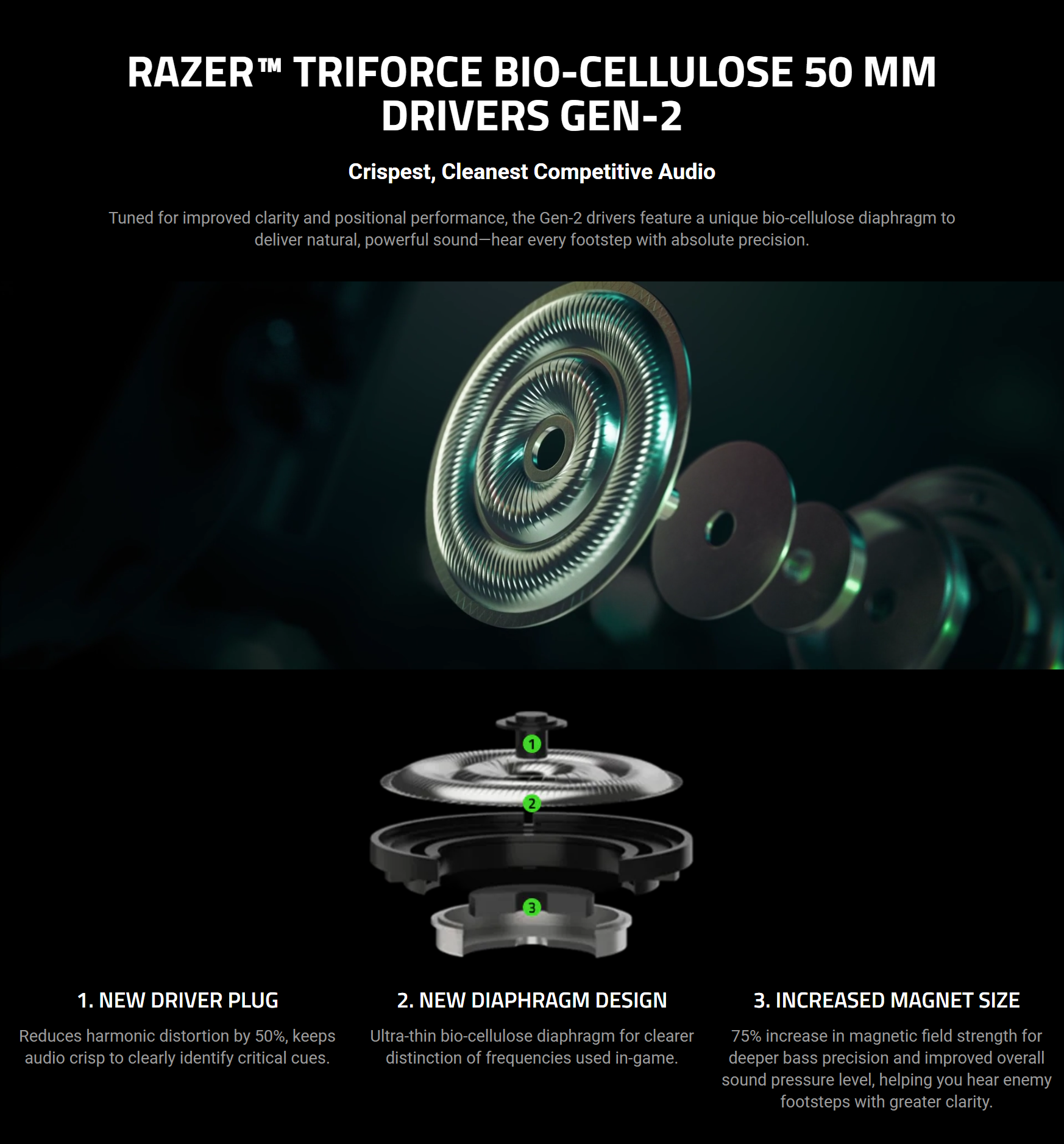 ✅ Razer TriForce Bio-Cellulose 50 mm Drivers Gen-2 ไดรเวอร์รุ่นใหม่ที่ปรับปรุงเสียงให้คมชัดและแม่นยำยิ่งขึ้น