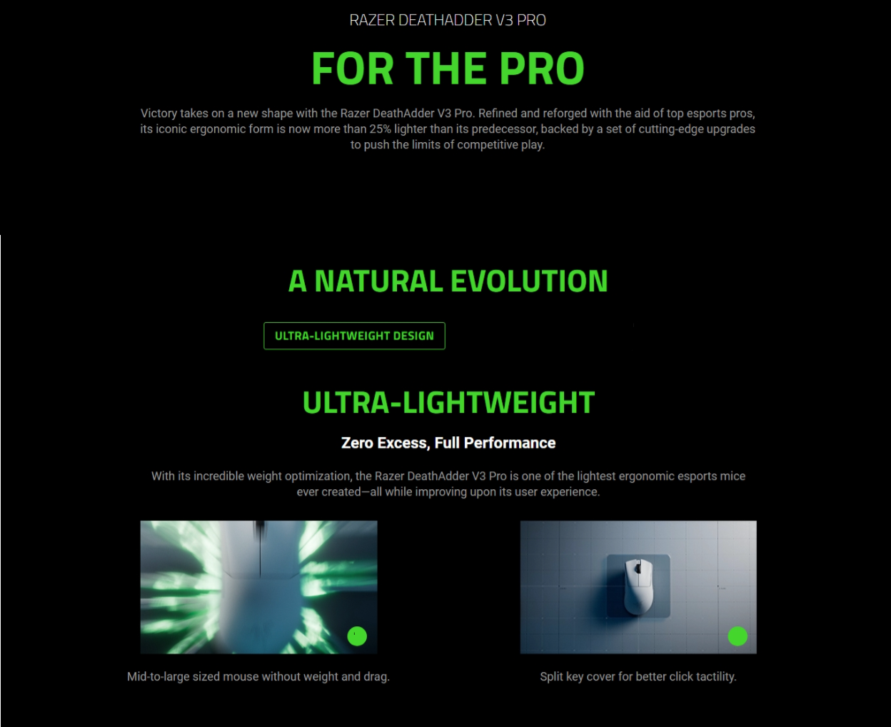 With its incredible weight optimization, the Razer DeathAdder V3 Pro is one of the lightest ergonomic esports mice ever created—all while improving upon its user experience.