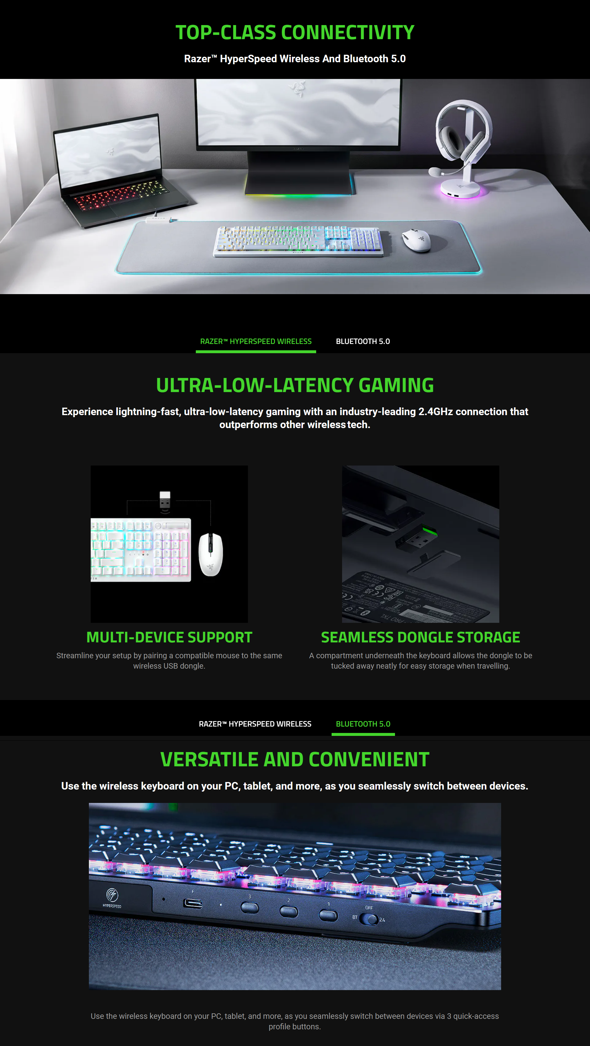 📌 CONNECTIVITY – Connect via Razer™ HyperSpeed Wireless (2.4 Ghz), Bluetooth, or Type-C