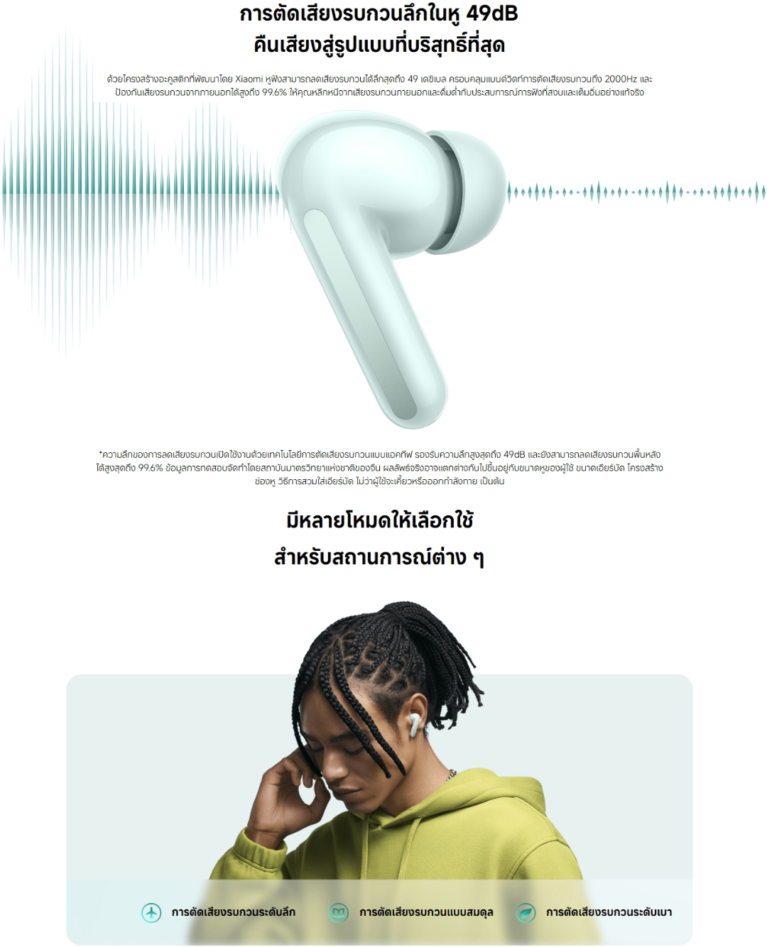 ด้วยโครงสร้างอะคูสติกที่พัฒนาโดย Xiaomi หูฟังสามารถลดเสียงรบกวนได้ลึกสุดถึง 49 เดซิเบล ครอบคลุมแบนด์วิดท์การตัดเสียงรบกวนถึง 2000Hz และป้องกันเสียงรบกวนจากภายนอกได้สูงถึง 99.6% ให้คุณหลีกหนีจากเสียงรบกวนภายนอกและดื่มด่ำกับประสบการณ์การฟังที่สงบและเต็มอิ่มอย่างแท้จริง