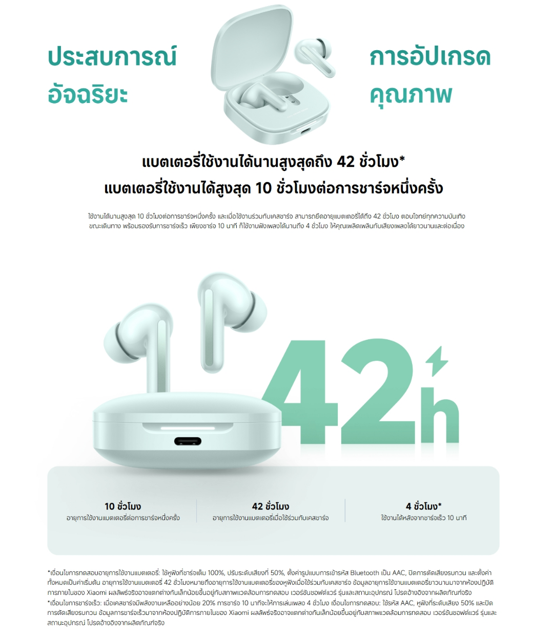 ✅ อายุการใช้งานแบตเตอรี่ : 10 ชั่วโมง และ 42 ชั่วโมงเมื่อใช้คู่กับเคส (ปิดการใช้งาน ANC)