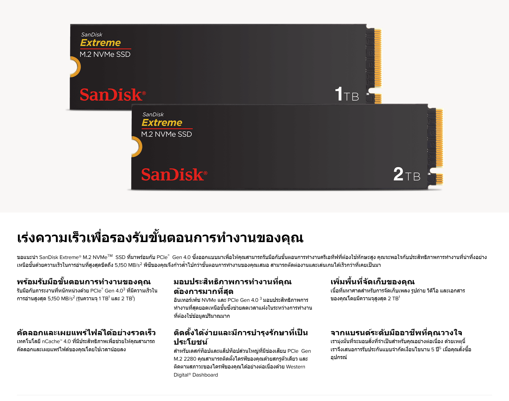 3. PCIe Gen 4.0 กำหนดว่าต้องใช้แผงวงจรหลักที่เข้ากันได้ SanDisk Extreme® M.2 NVMe™ SSD สามารถใช้ได้กับรุ่นเก่าคือ PCIe® Gen 3.0
