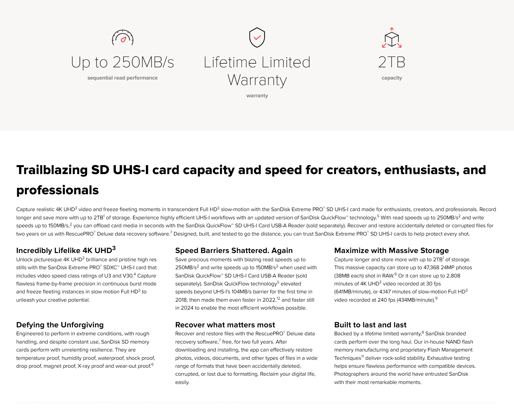 🔹 Blazing read speeds up to 250MB/s and write speeds up to 150MB/s when used with SanDisk QuickFlow SD UHS-I Card USB-A Reader (sold separately)
