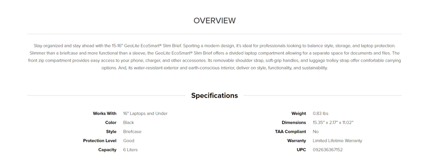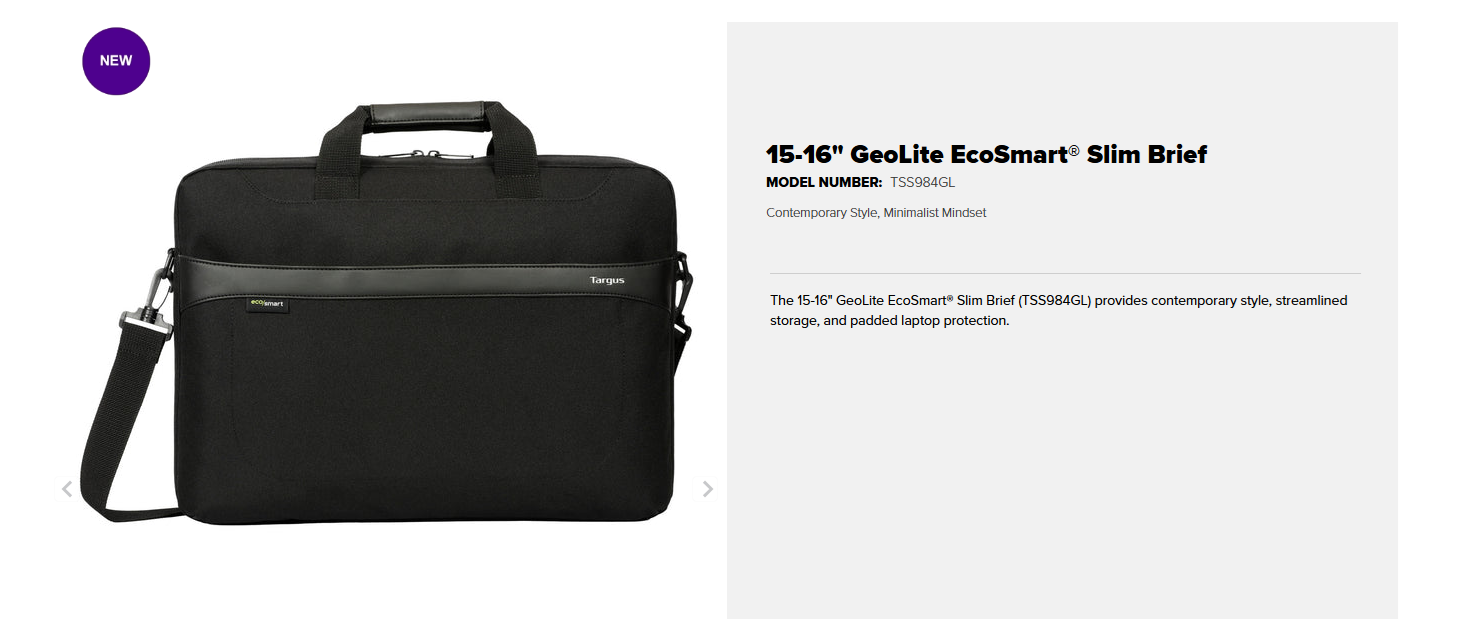 Stay organized and stay ahead with the 15-16″ GeoLite EcoSmart® Slim Brief. Sporting a modern design, it’s ideal for professionals looking to balance style, storage, and laptop protection. Slimmer than a briefcase and more functional than a sleeve, the GeoLite EcoSmart® Slim Brief offers a divided laptop compartment allowing for a separate space for documents and files. The front zip compartment provides easy access to your phone, charger, and other accessories. Its removable shoulder strap, soft-grip handles, and luggage trolley strap offer comfortable carrying options. And, its water-resistant exterior and earth-conscious interior, deliver on style, functionality, and sustainability.