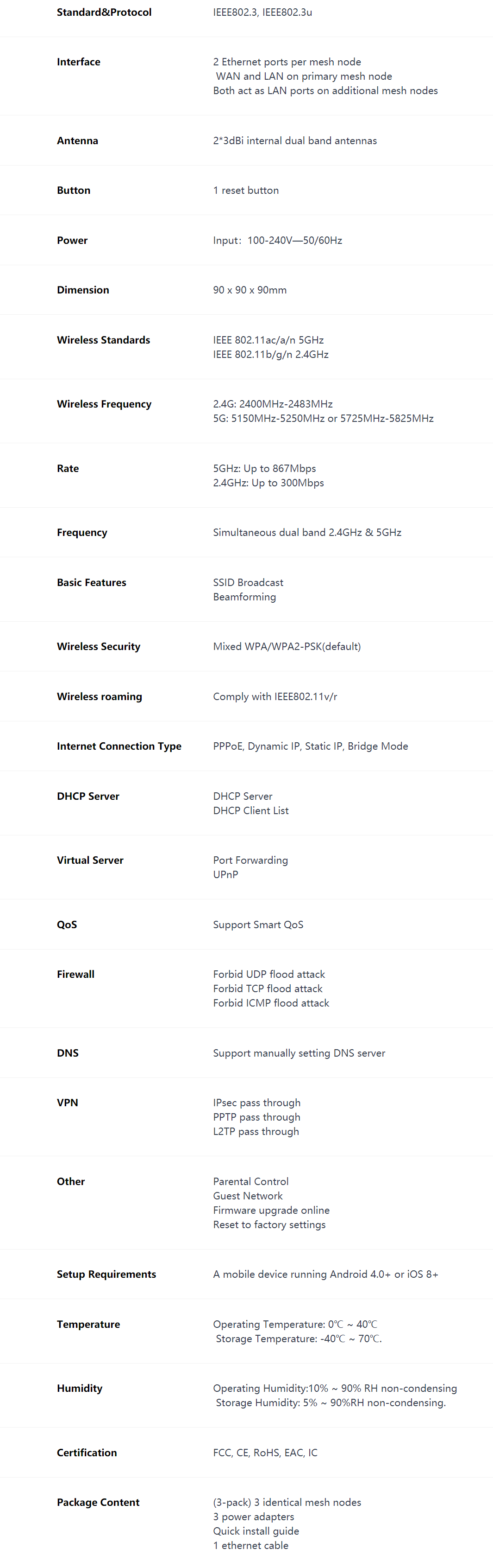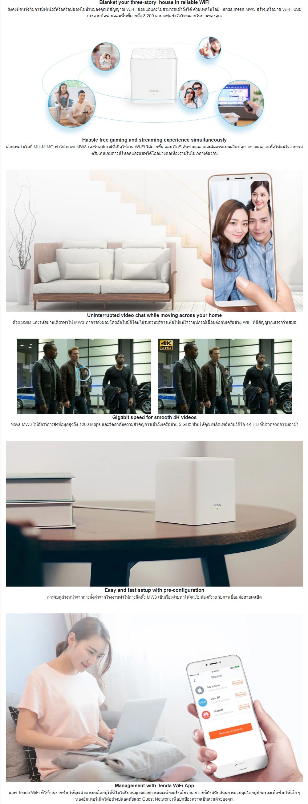 เป็นระบบจ่ายคลื่นความถี่ 1200 Mbps ที่ออกแบบมาสำหรับครอบครัว 1,100 – 3,200 ตารางฟุตทำให้คุณได้รับความครอบคุมของ Wi-Fi ภายในบ้านทั้งหมดรวมถึงการเข้าถึงอินเทอร์เน็ตที่รวดเร็วและมีเสถียรภาพ ชุดที่ 3 ให้พื้นที่ครอบคลุม Wi-Fi สูงสุดถึง 3,200 ตารางฟุตในขณะที่ชุดที่ 2 ให้พื้นที่ครอบคลุมมากถึง 2,200 ตารางฟุต สอดคล้องกับมาตรฐาน IEEE 802.11v และ IEEE 802.11r โรมมิ่งที่ราบรื่น, nova MW3 รองรับการเพิ่มประสิทธิภาพเครือข่ายอัตโนมัติและการเลือกเส้นทางอัตโนมัติช่วยให้คุณเพลิดเพลินกับเครือข่ายไร้สายที่เสถียรและยืดหยุ่นมากขึ้น