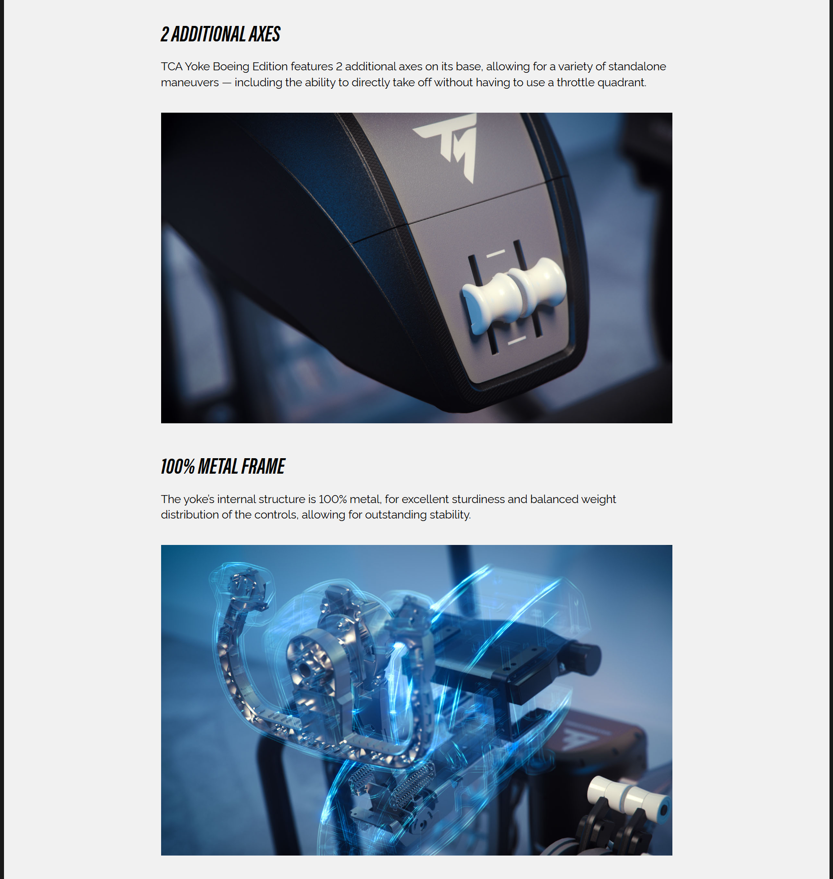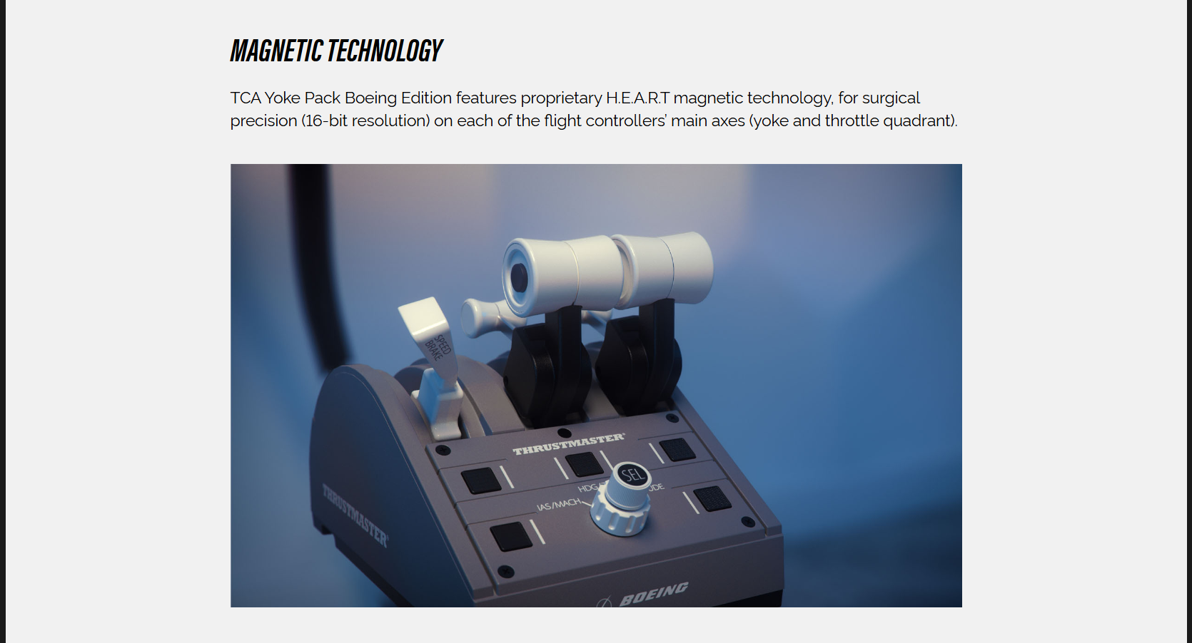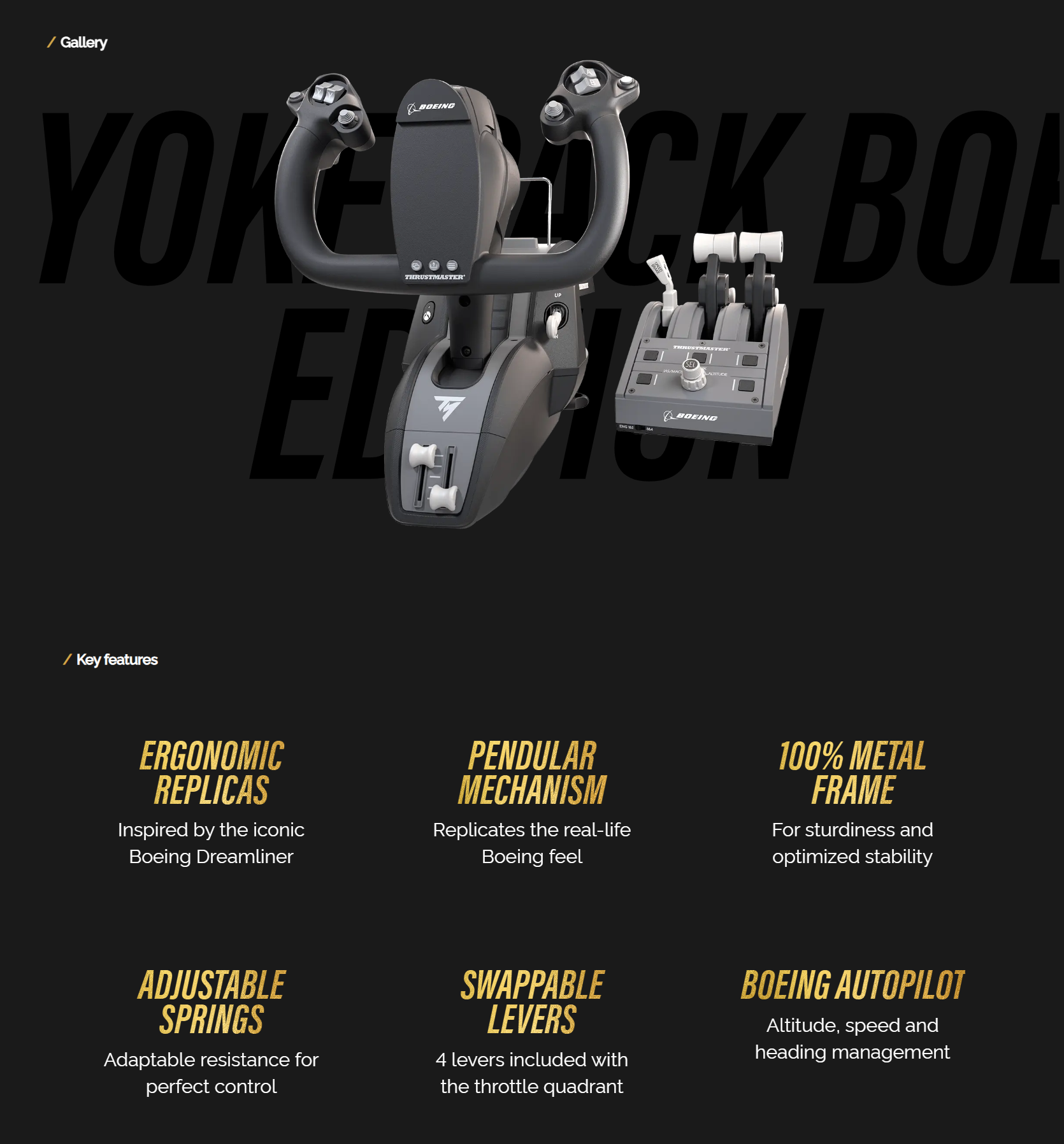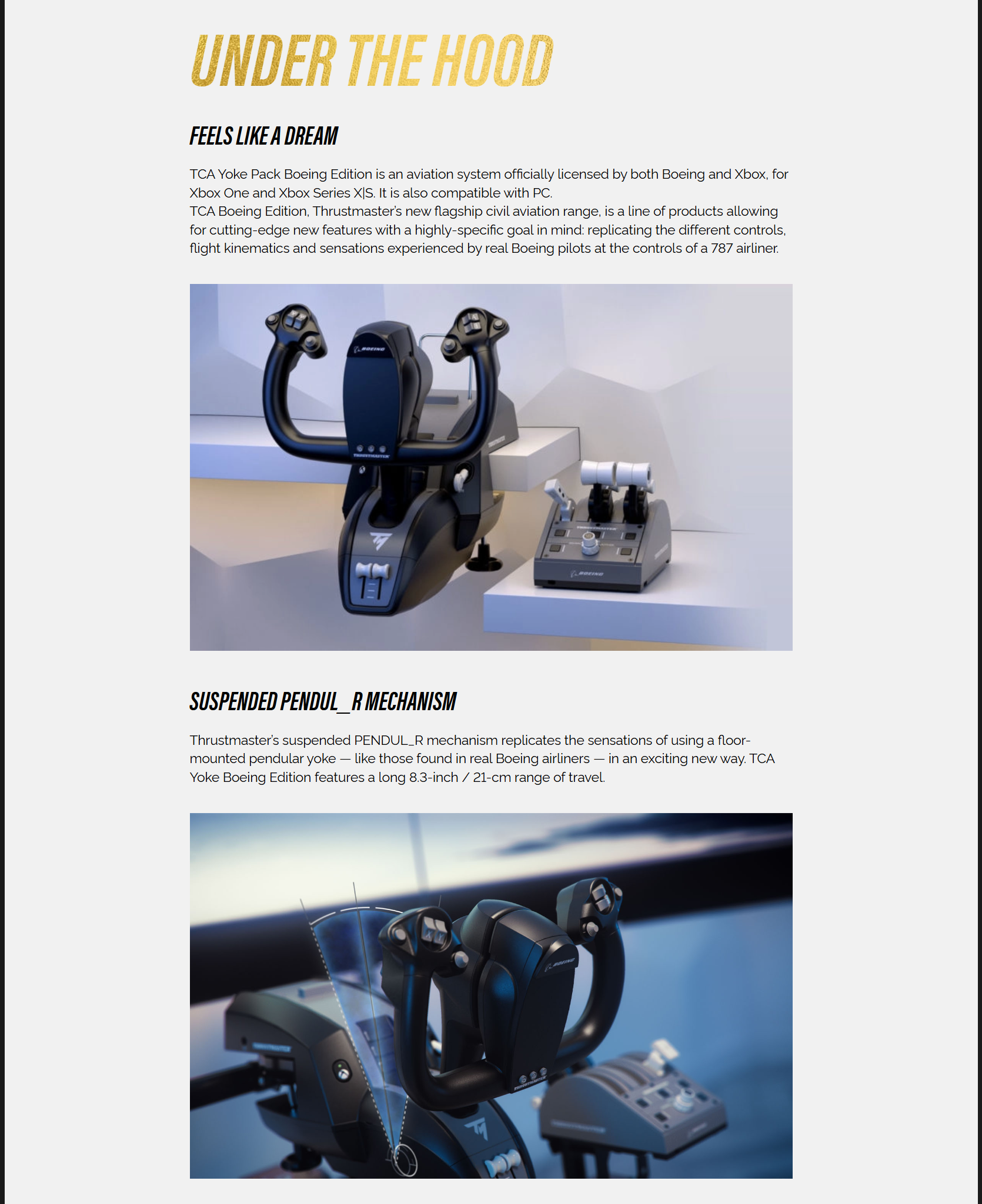 TCA Yoke Pack Boeing Edition is an aviation system officially licensed by both Boeing and Xbox, for Xbox One and Xbox Series X|S. It is also compatible with PC.