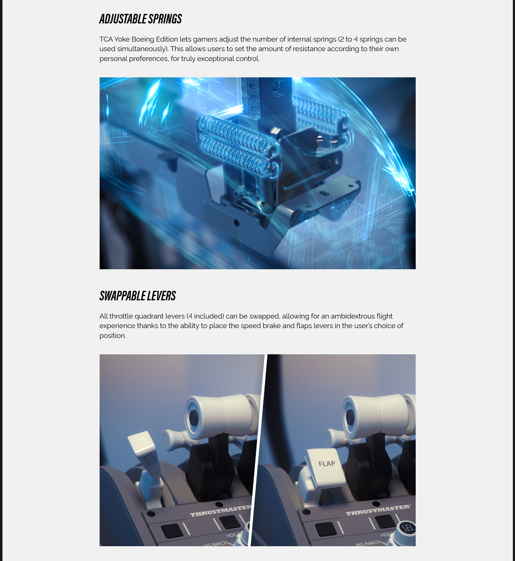 TCA Yoke Boeing Edition lets gamers adjust the number of internal springs (2 to 4 springs can be used simultaneously). This allows users to set the amount of resistance according to their own personal preferences, for truly exceptional control.