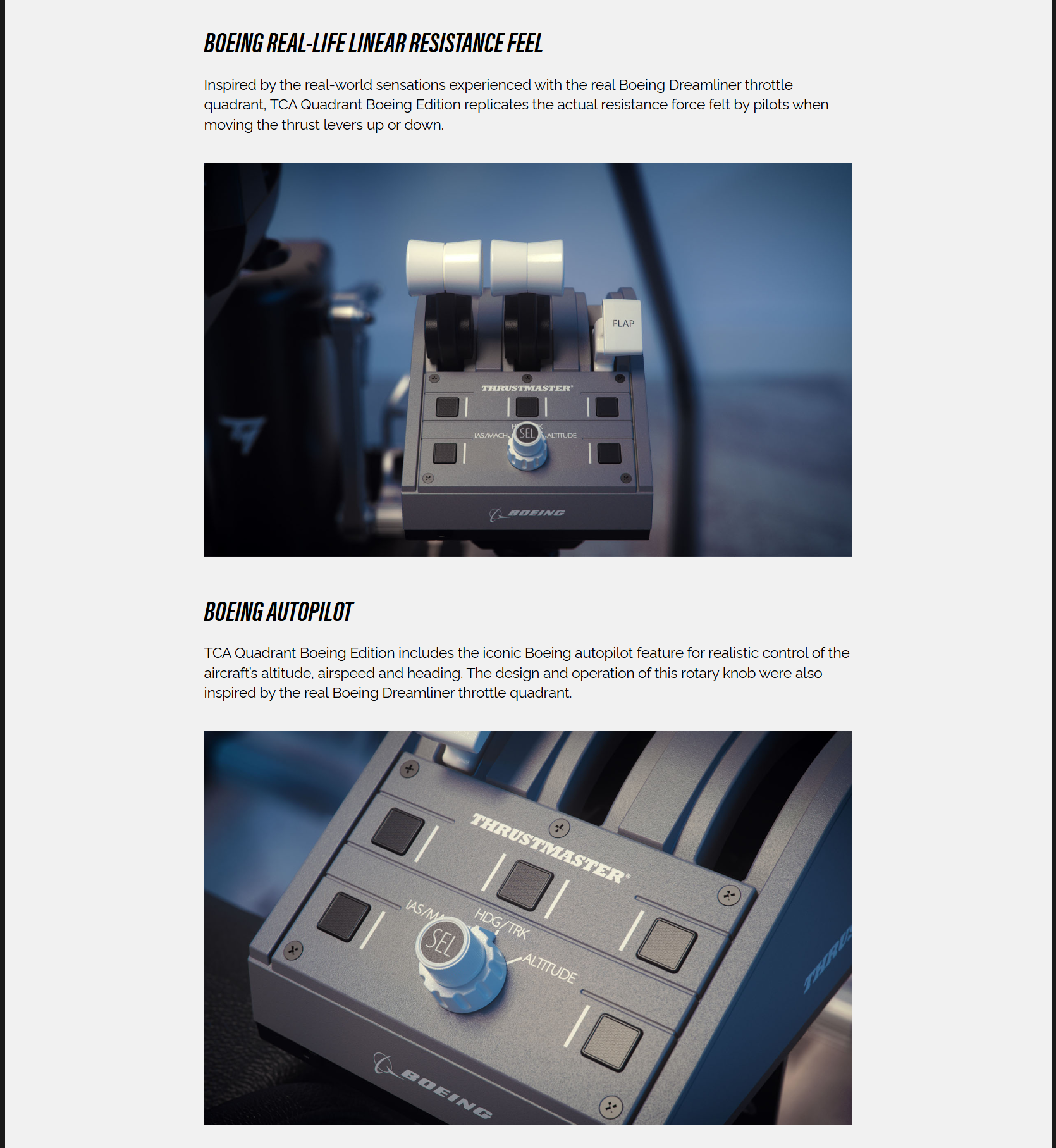 TCA Boeing Edition, Thrustmaster’s new flagship civil aviation range, is a line of products allowing for cutting-edge new features with a highly-specific goal in mind: replicating the different controls, flight kinematics and sensations experienced by real Boeing pilots at the controls of a 787 airliner.