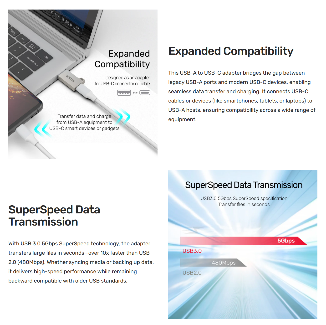 UNITEK Adapter USB-A to USB-C Ultra-Tiny Zinc [A1034NI] อะแดปเตอร์ ของแท้ ประกันศูนย์ 2ปี