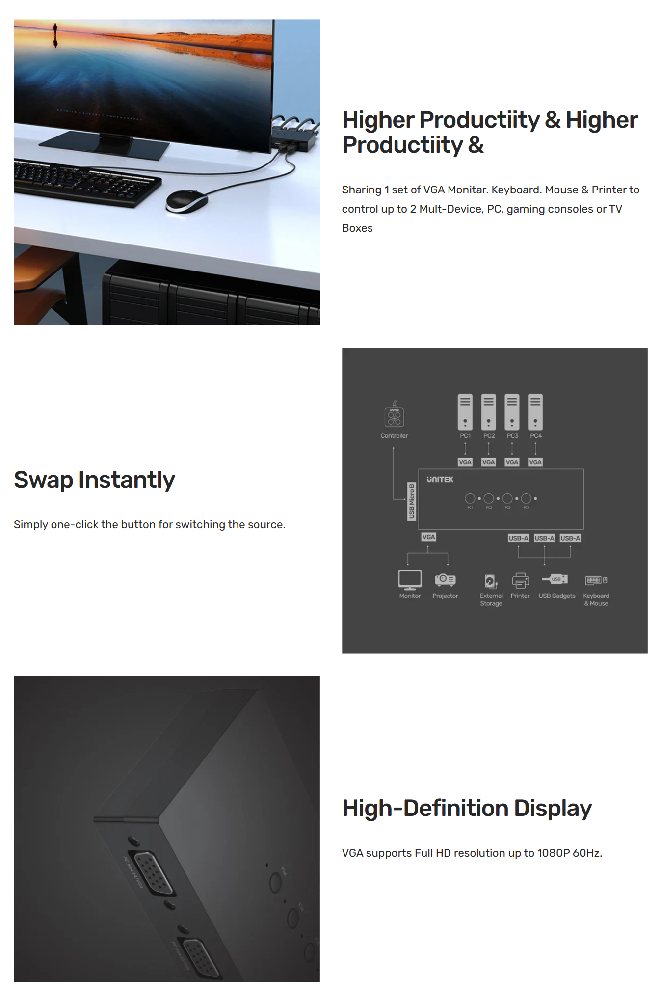 UNITEK U-8709ABK VGA KVM Switch 2-IN-1 ของแท้ ประกันศูนย์ 2ปี