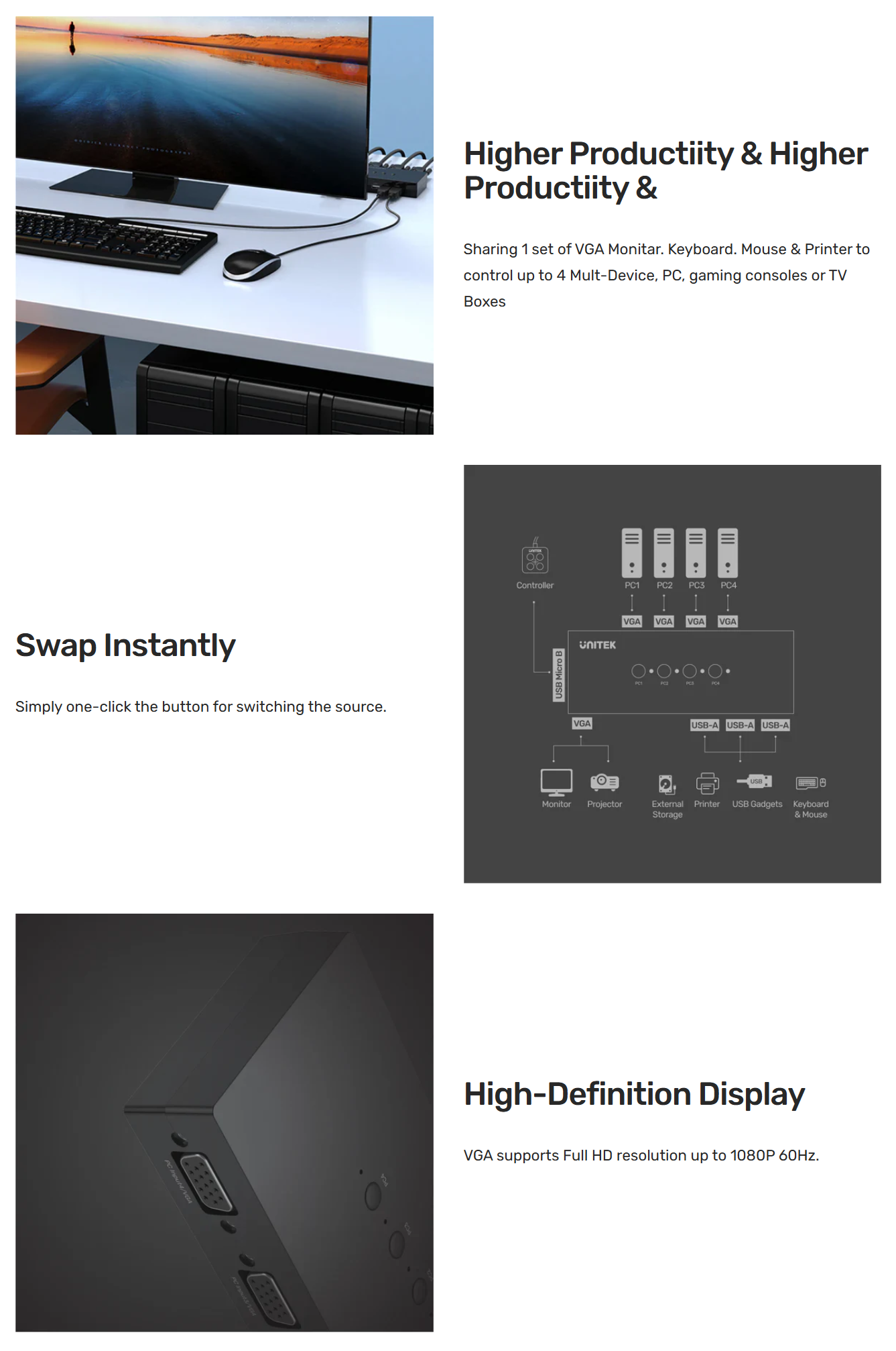 UNITEK U-8710ABK VGA KVM Switch 4-IN-1 ของแท้ ประกันศูนย์ 2ปี