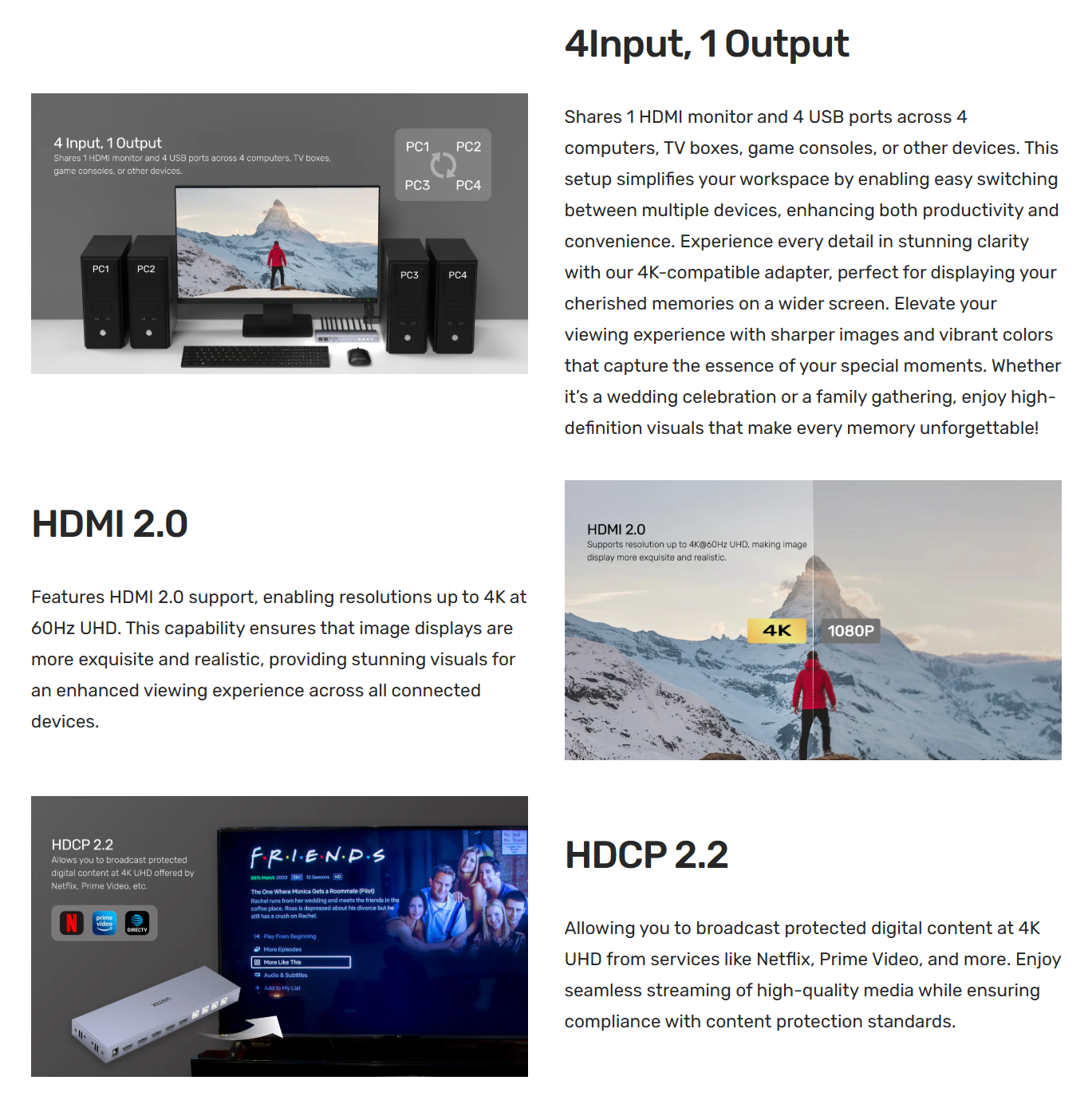 ✅ อินพุต/เอาต์พุต: 4 อินพุต, 1 เอาต์พุต สำหรับแชร์หน้าจอ HDMI หนึ่งจอและพอร์ต USB 4 ช่อง